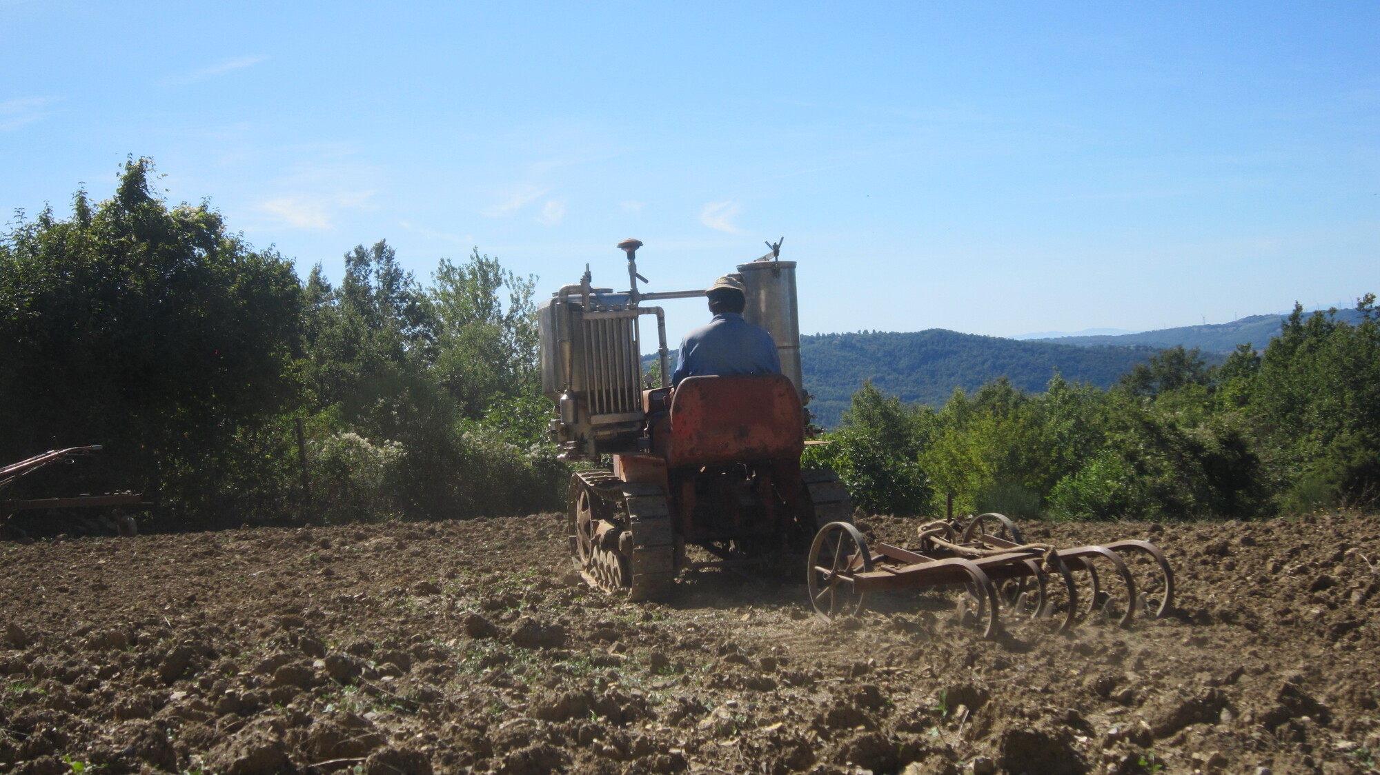 today the tractor goes to real work…after plowing and some rain a lot of weeds are grown on the field…first we tried with the motorcultivator and the horse harrow, but this morning we have had difficult with starting, probably the valves need some grinding…so we decided to try the crawler with the horse harrow, because his harrow - a heavier tool- is not ready yet…