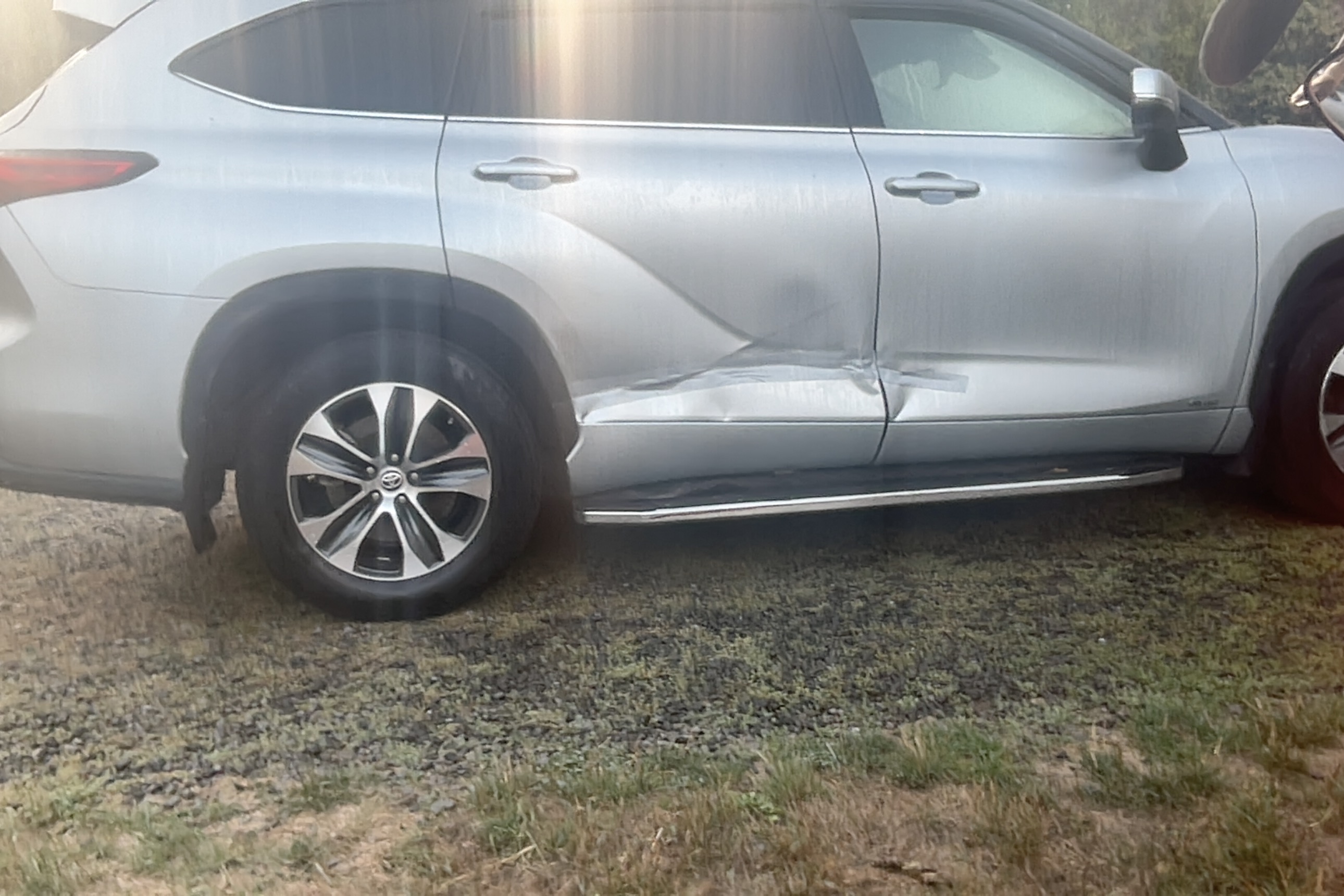 Yep. Yep. She over-focused avoiding a protruding sign on her left side and a ground mounted very stout sign on her right side reached out and bit her! She got Titanic’ed. At her next grocery store stop, when she saw the extent of the damage, she sat down and cried. Then puked.