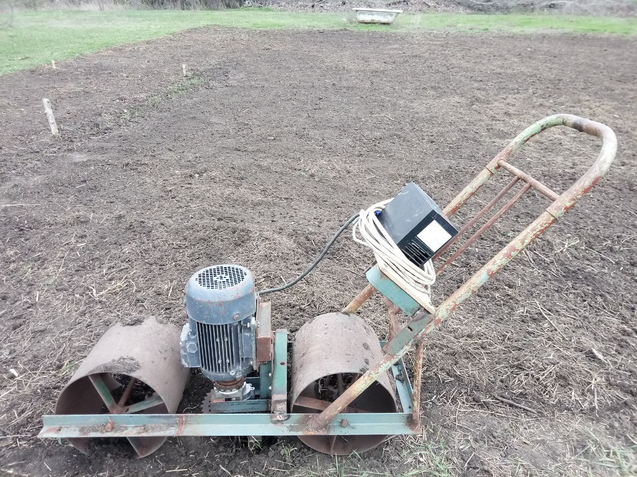 Electric cultivator. 1500 rpm motor, 2.2 kW, 3 kW frequency converter, 1:5 gearbox, 4 knives, rollers made of a propane cylinder. The depth of cultivation is 5 cm, with complete mixing of the soil. This cannot be done by hand.