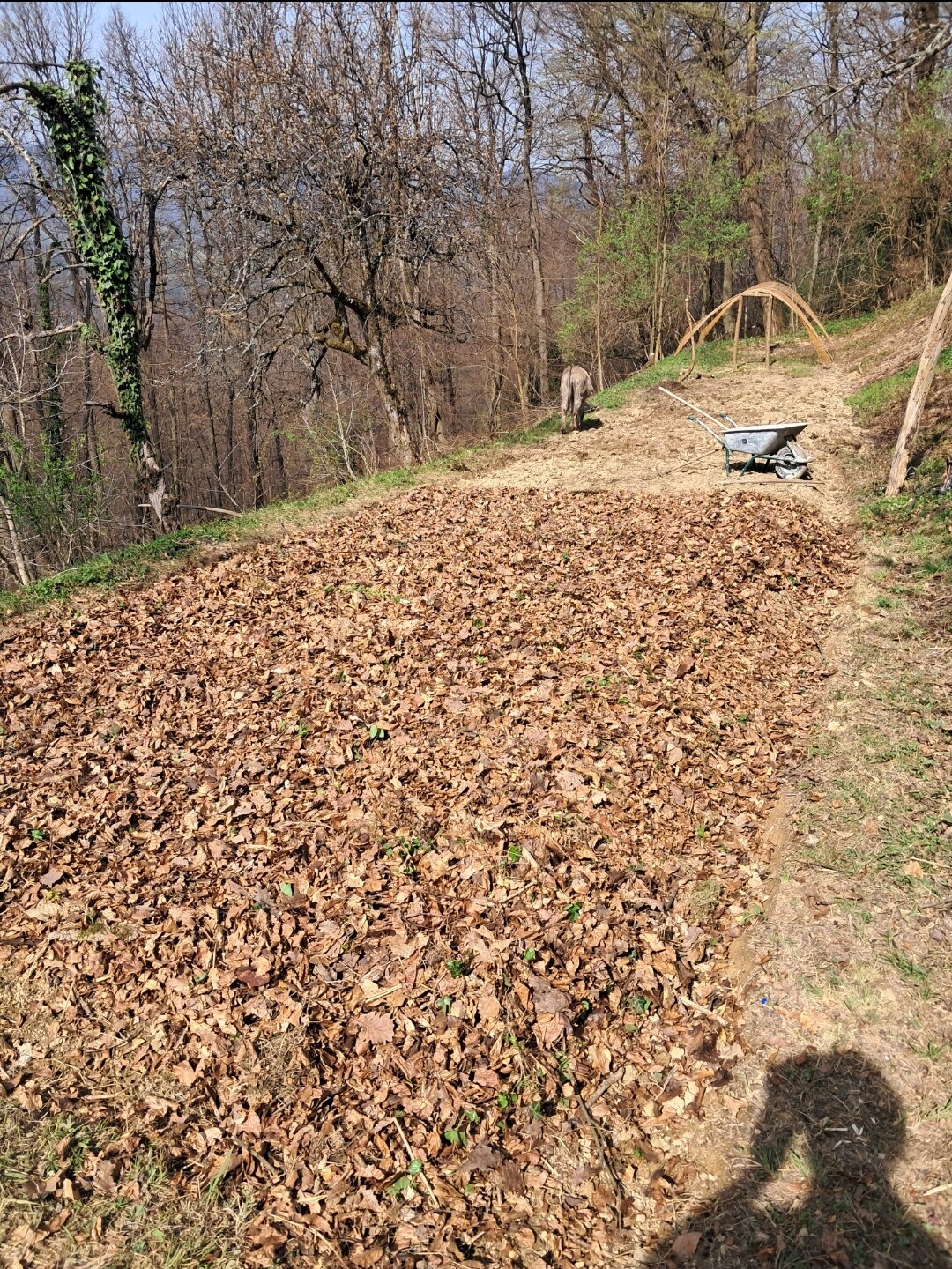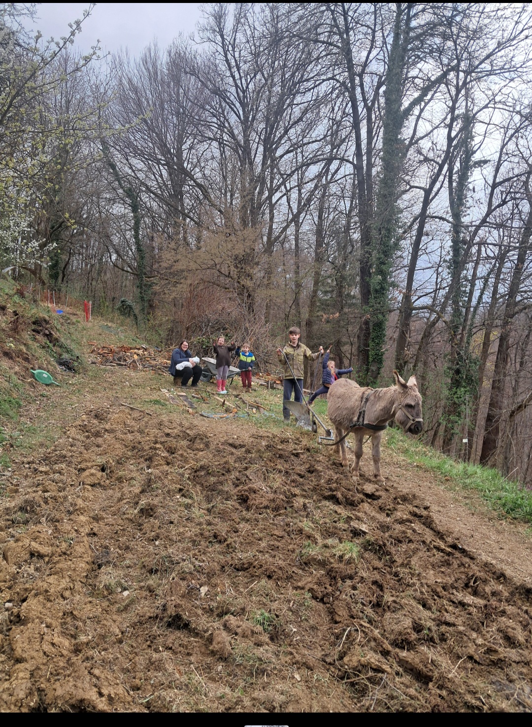 This is virgin soil, gras sod and lots of weeds like blackberry and plumb tree roots. So l too plowed it at a depth of about 7cm, wich is l can manage with our trusty gray companion. After planting "early potatoes in this case) leaves are added and in the future years l will not plow this at all any more.