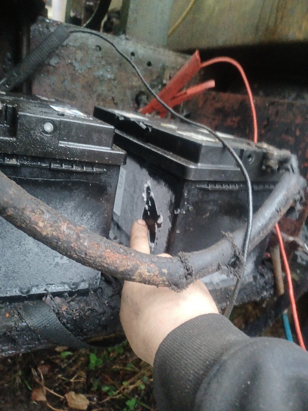 After searching for a while i found a small car space heater, to “defrost” them some. When putting in the plug the heater showered the batteries in blue and green sparks, and the magic smoke leaked out, then it blowed a main fuse.