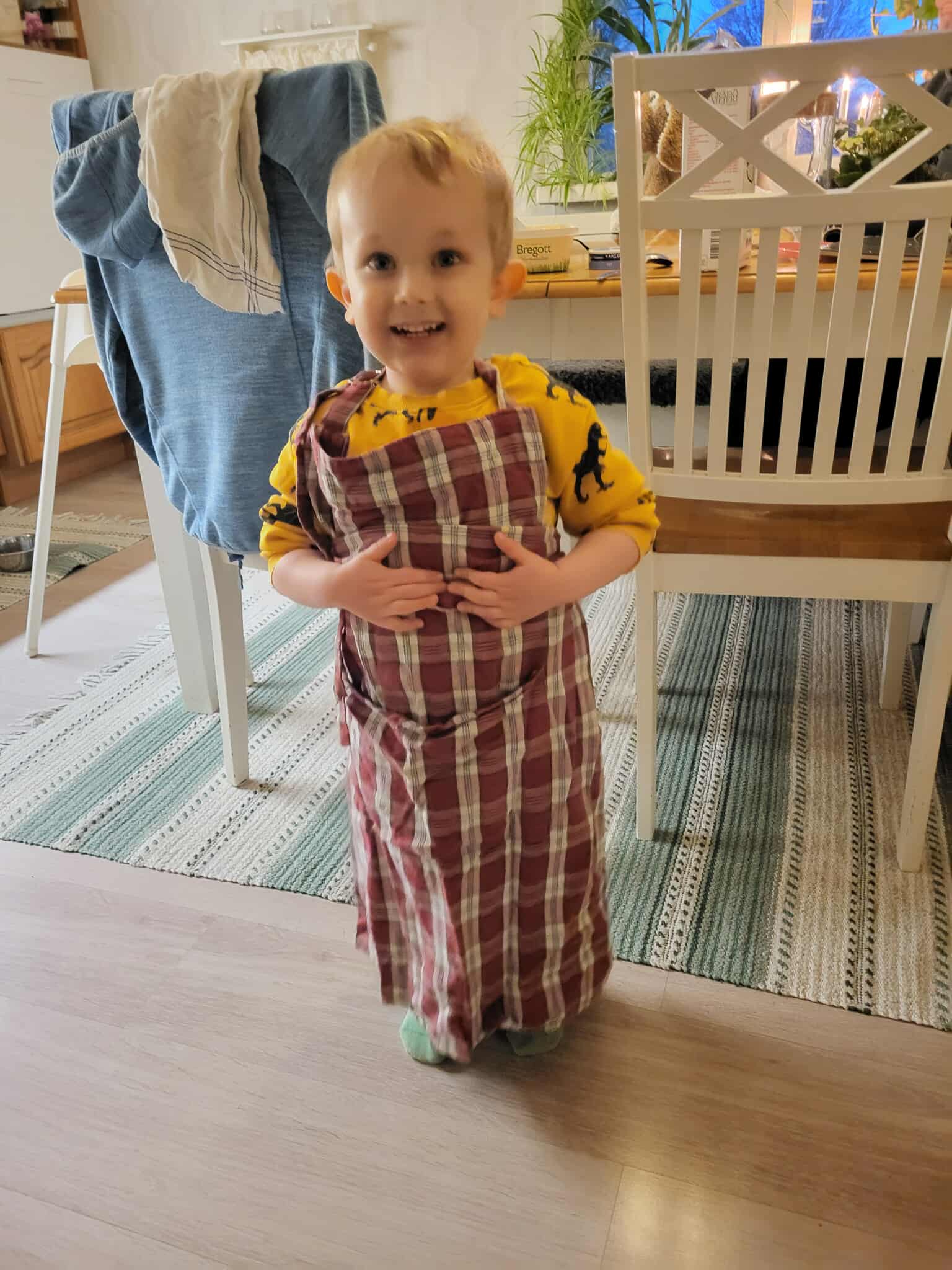 Youngest two grandchildren are visiting and Helmer sleeping over. Too cold for outdoor playing in the snow, but he is just as happy getting dressed for and helping out baking bread.