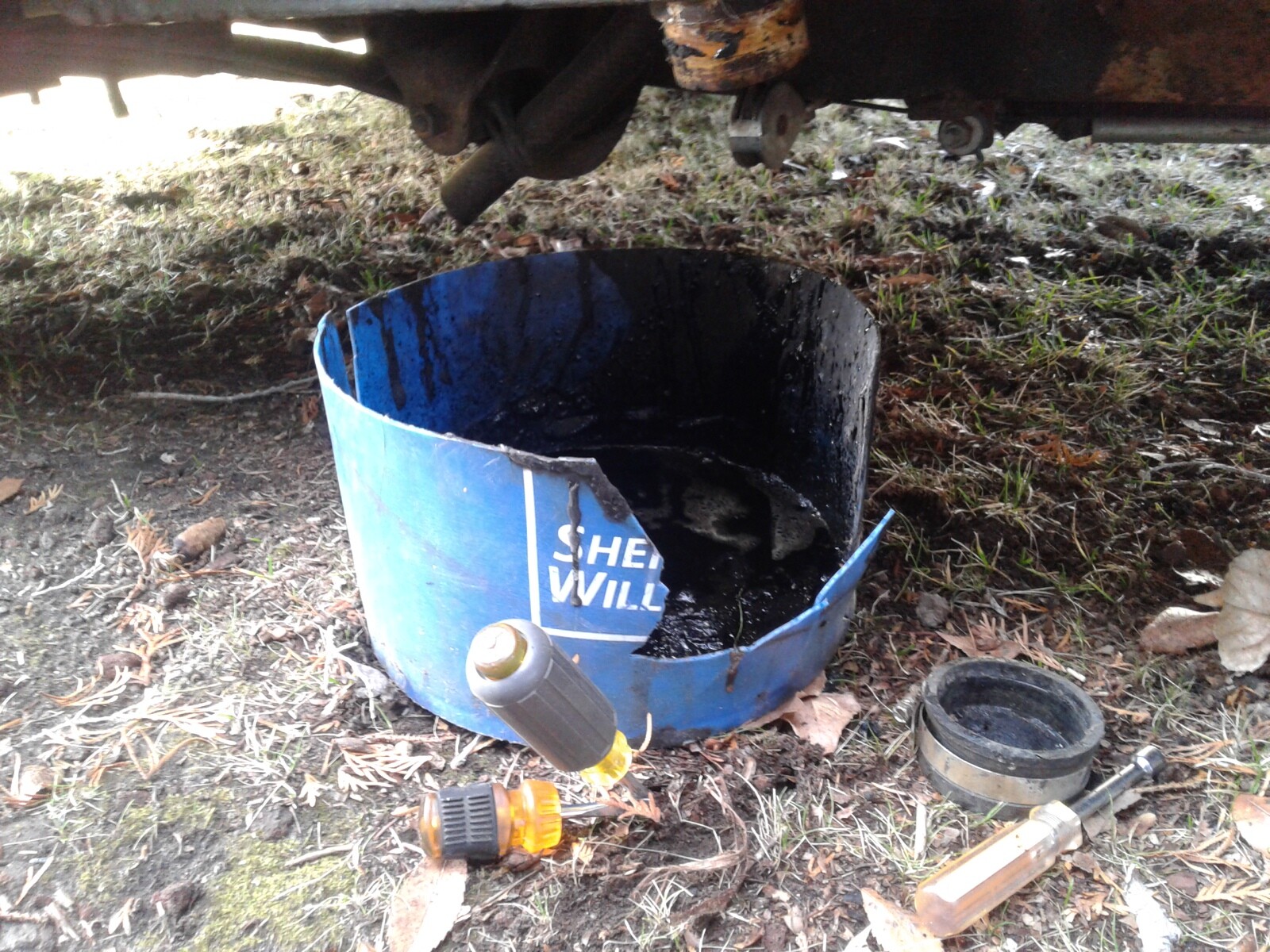 Some progress, ( 2 days later ) on my tar/water dumping. The water is out of the tank. But the tar is taking its time to drip out and into the bucket. Bob : Make a note to always while it is warm and before the winter sets in with freezing temperatures to dump all the black water/tar out of the tank.