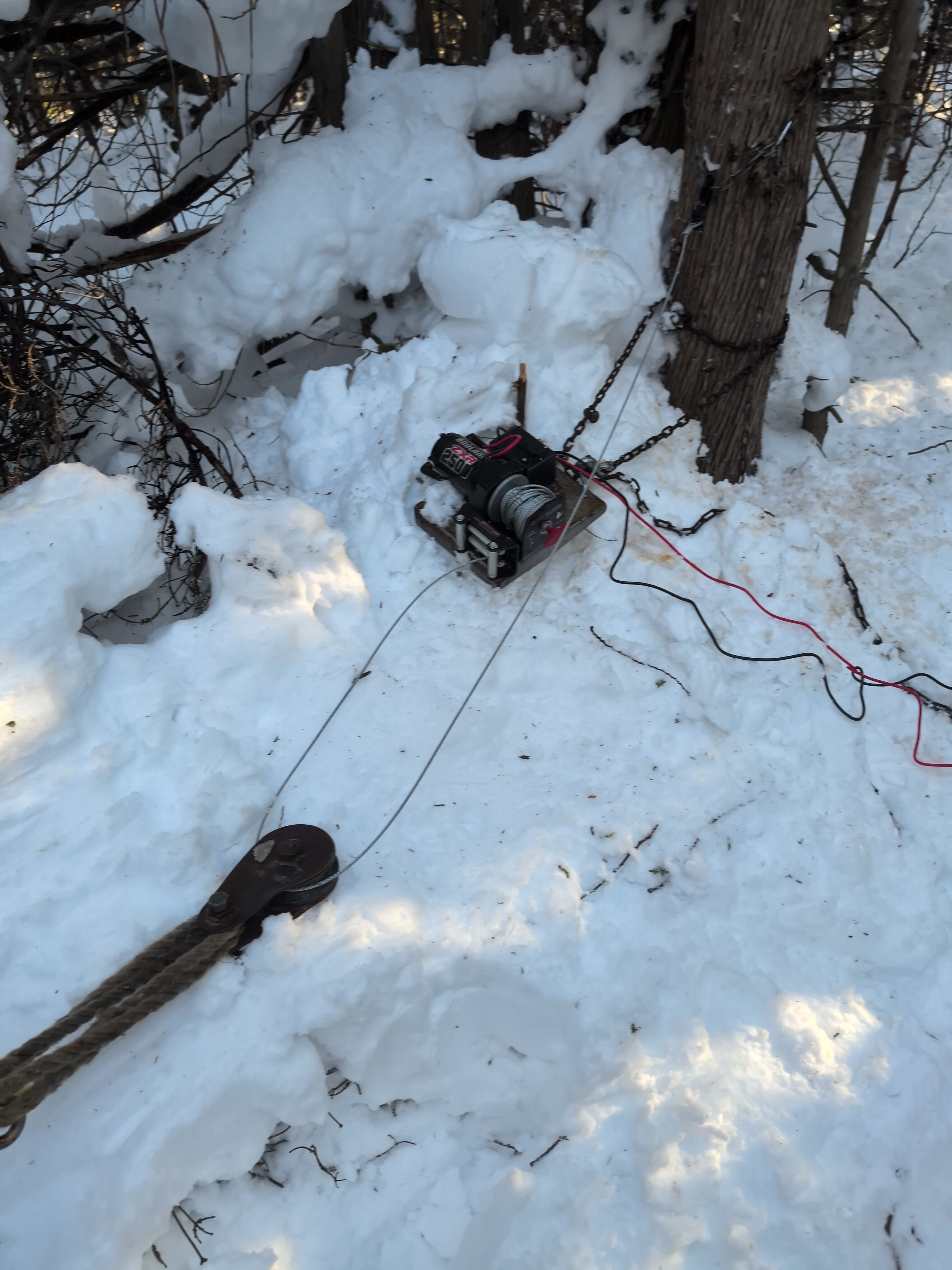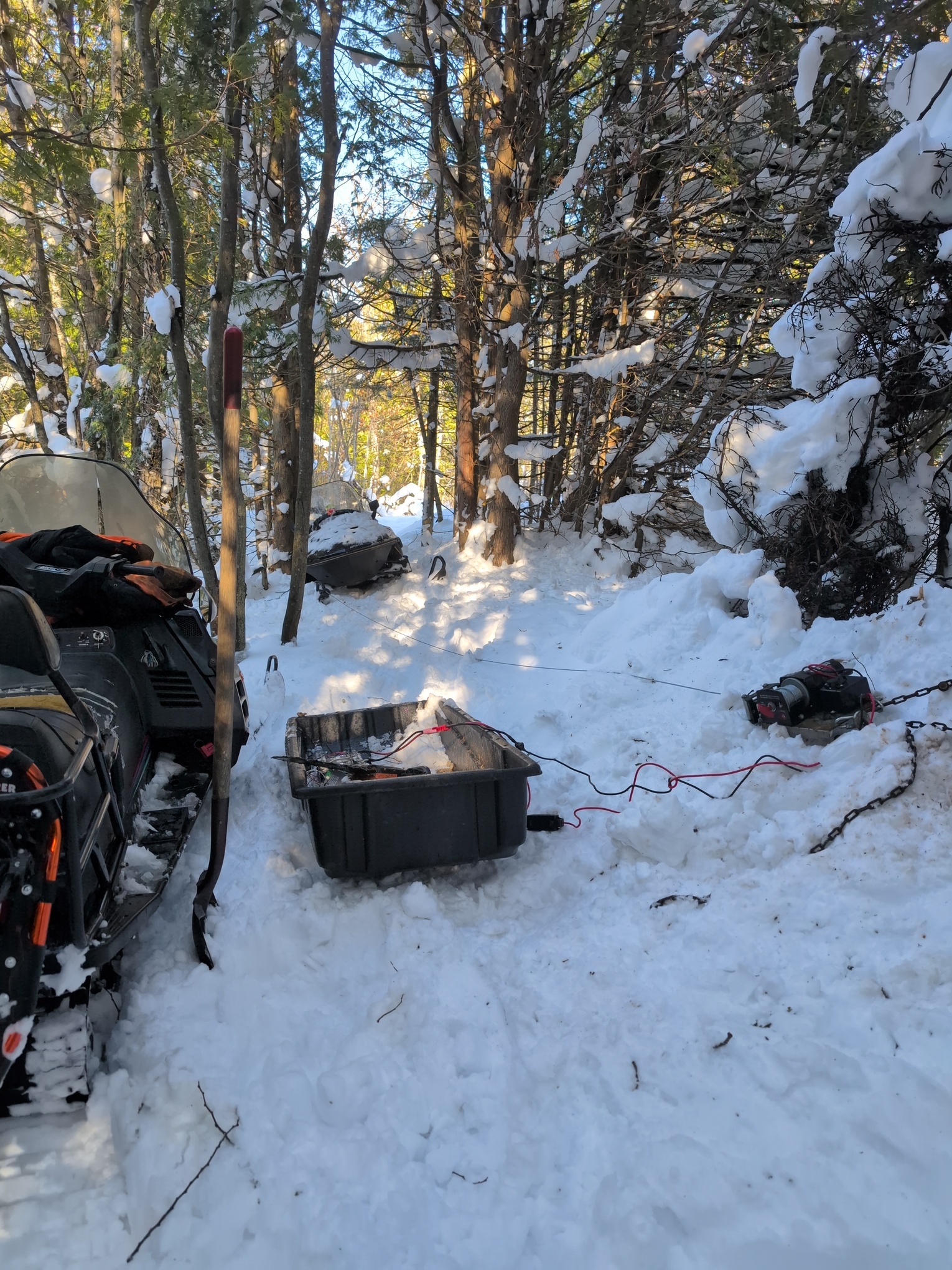 Stuck stuck stuck! The snow is six feet deep here, and the man simply sinks in helplessly without snow shoes. I am using a 12v Harbor freight winch to pull the lead sled out. Single sheave, double power. LiFePo4 100 ah battery. I got the rescue sled stuck too. I had to do four different pulls to get everything out.