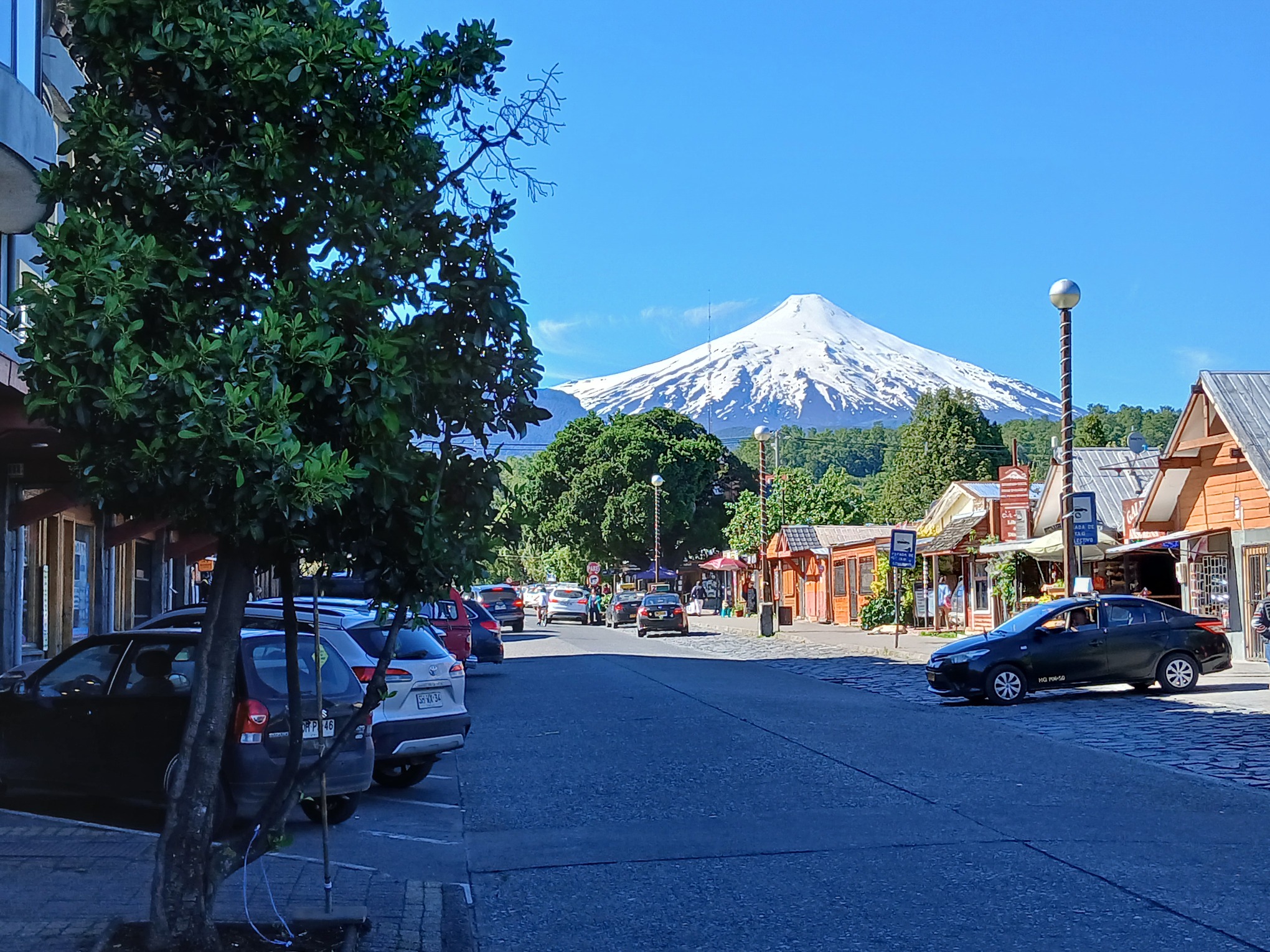 Bronlin gets a gold star. It is indeed VolcĂĄn Villarrica. Every so often (in years) it erupts, mainly with lava burped into the air above. Otherwise it quietly releases gas plumes.