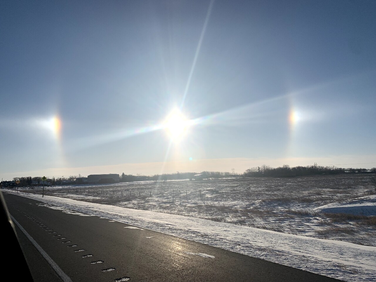 We had a cold snap come in with a strong movement of air, sustained winds of 30 - 50km, light snow to start with. The wind was strong enough to loft ice crystals several hundred feet, producing strong sundogs in places. Air temp was between minus 23 and minus 27 producing windchill near minus 40. On Tuesday theyâre forecasting plus.4.