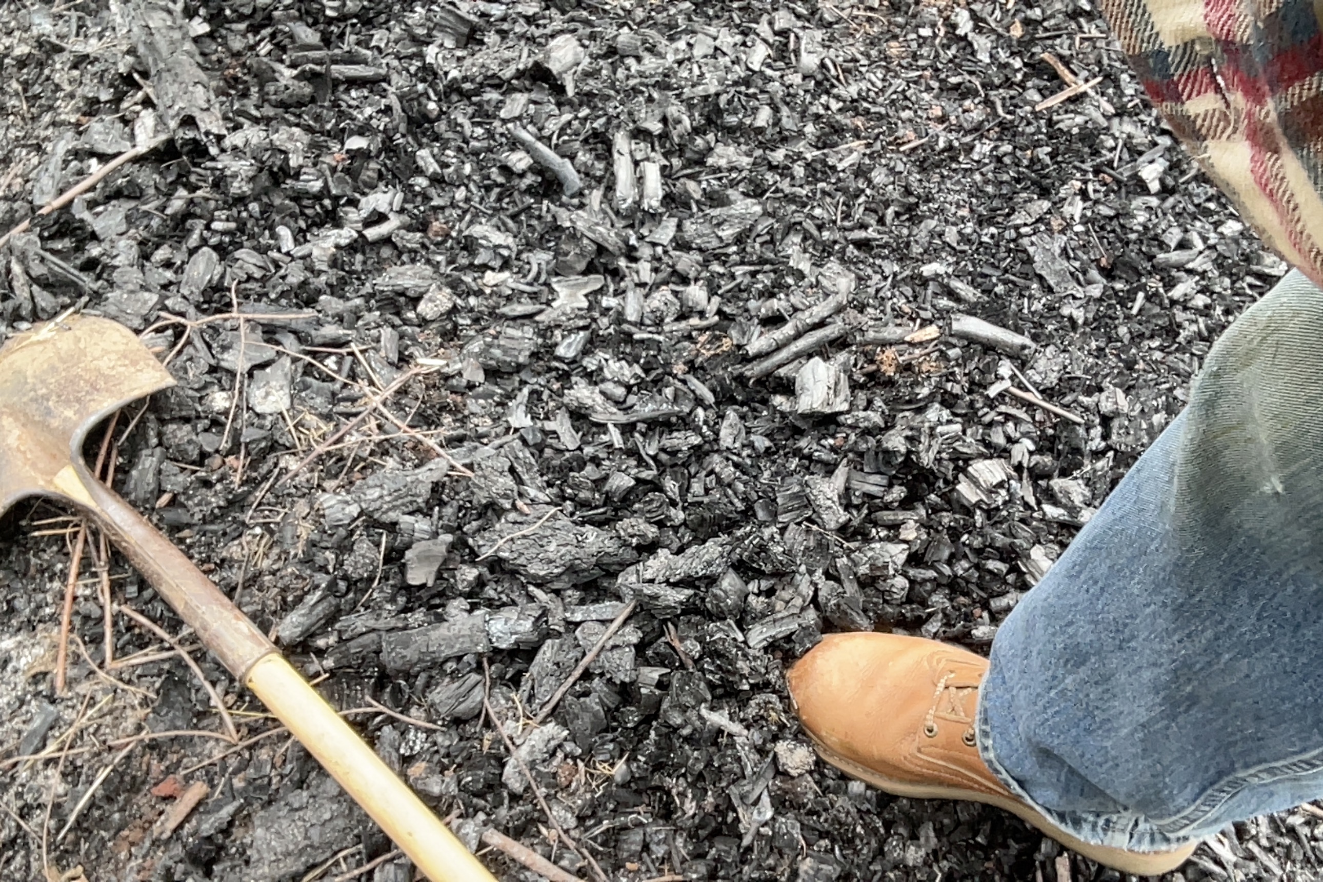 You rake up and bucket store; or bag that charcoal. Drying it some before use alongside the next big bonfire.