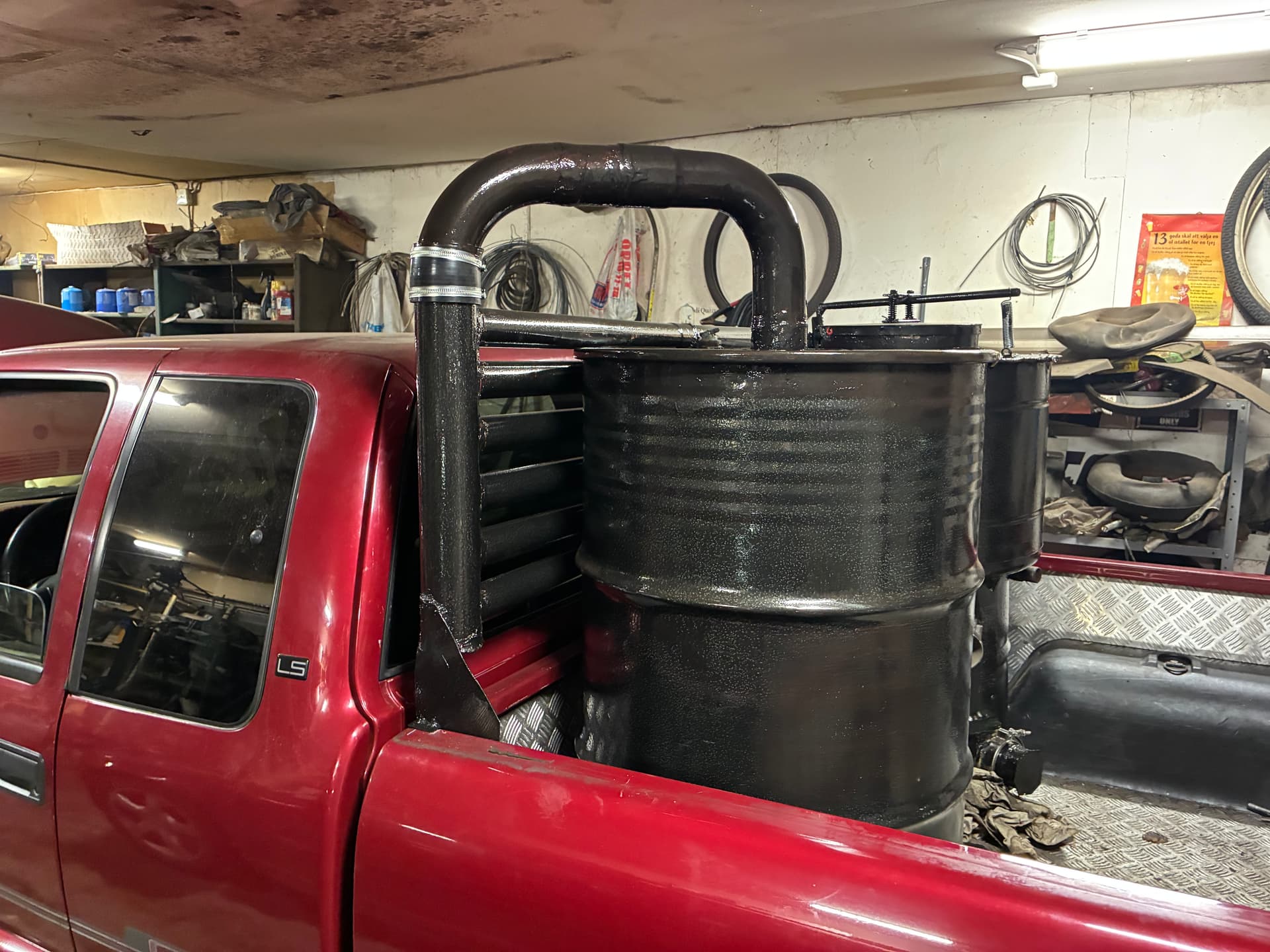If you tape lengths of yarn all over the gasifer, cooling rack and bed edges you will see at any speed the low pressure created behind the cab and now the gasifer pulls the air flow forwards.