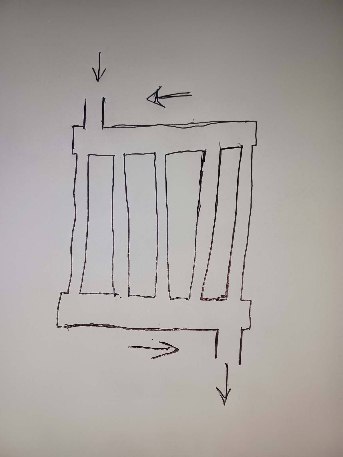 Now the flow will change if there is a obstruction in the pipe and that would change the flow in that pipe. My cooling pipes seem to plug up first with the lower pipes or one side of my pipes system first. Yes heat rises and my top pipes are hotter on my cooling pipe rails that are up right. I am not sure about the heat if they are flat on a roof of a car, I would think they would be all the same, except again for flow obstructions in the pipes. On my cooling system my main header pipe coming out of my drop box is larger going to smaller pipes. They are also slanting down to the back of the bed of the truck. This helps the moisture and soot to flow down the pipes to condensation tank.
