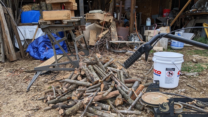 . The next version will have a fixed blade angle, with a narrow slot for the blade. The gap here is about 3/4 inch, say 2 cm. Chunks with a diameter smaller than that can get stuck between the base and the blade. This happened once, with no real problem. The foot switch works well, since you can step back, tap the switch, and stay away from the moving blade. The current blade guard will be replaced with a rigid fence, with something like a 2x6 on top covering the blade. This will form a U-shaped guard with a 2 inch/5 cm slot to slide the sticks into. Less blade exposed, and some protection from pieces flying in the operator’s direction. A chute below and to the right of the blade to fill a bag, bucket, or box would be a good idea also.