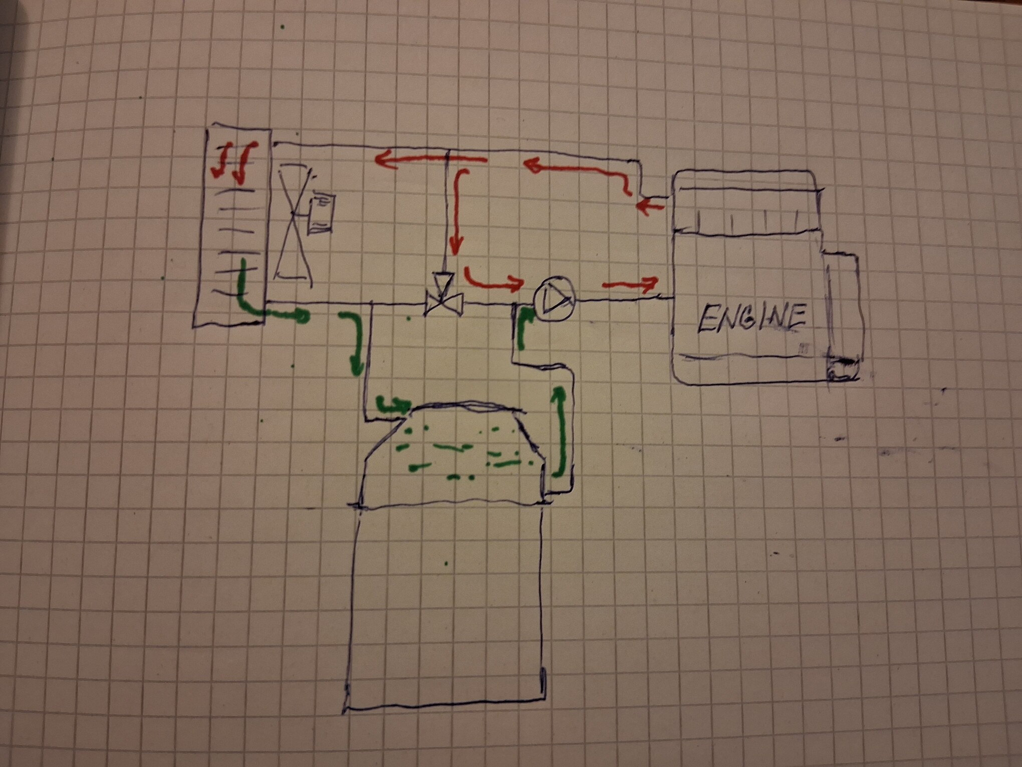 I was thinking a little about how to easily connect the cooling of the condensation zone to the engine cooling system without an additional pump with the goal of getting cold water to cool the gasifier… well, the sketch is one thing, but the configuration of the thermostat and pump placement on the engine is another…