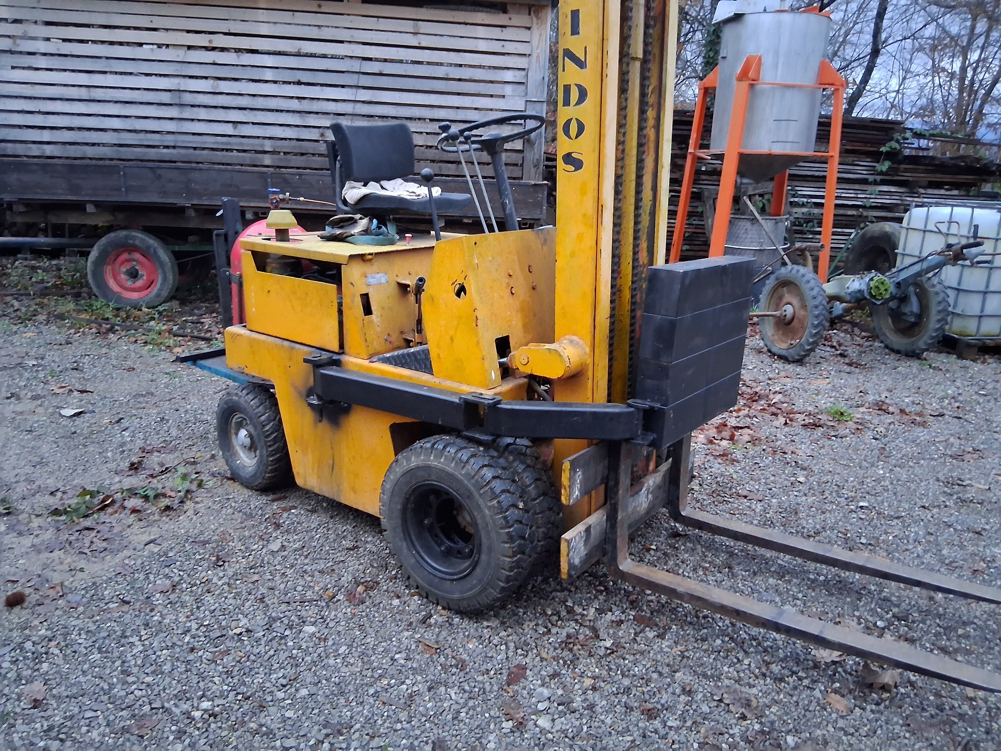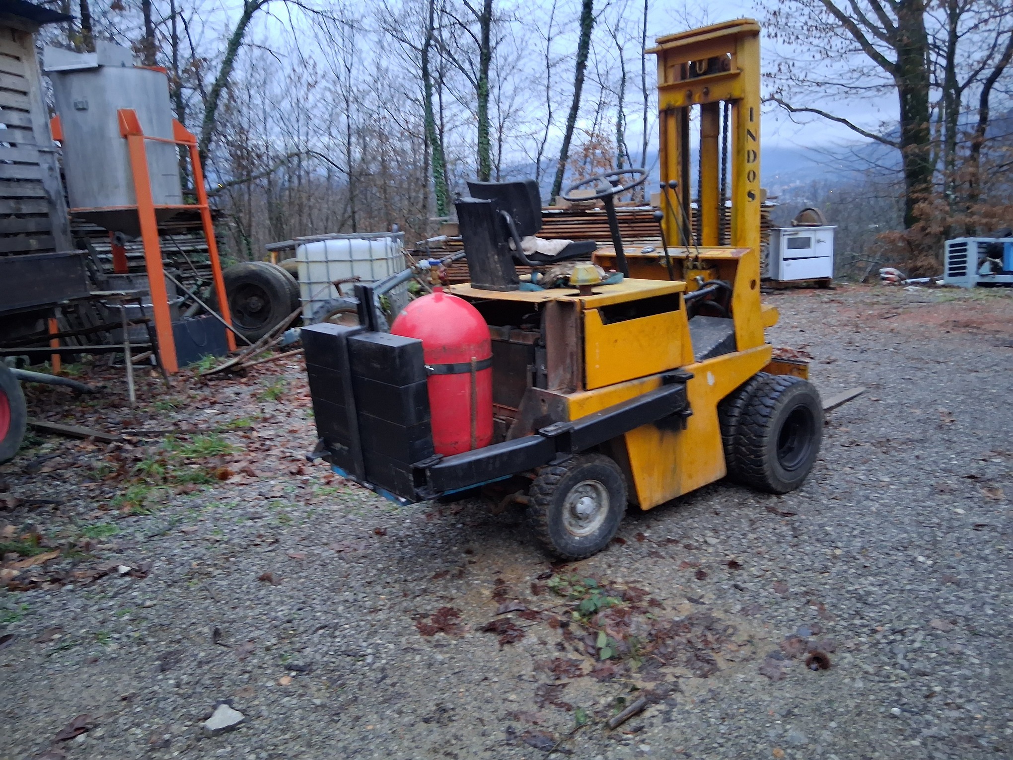 I live on steep terrain, so I installed a movable weight (400 kg) on the forklift, which I move to the front when driving uphill.