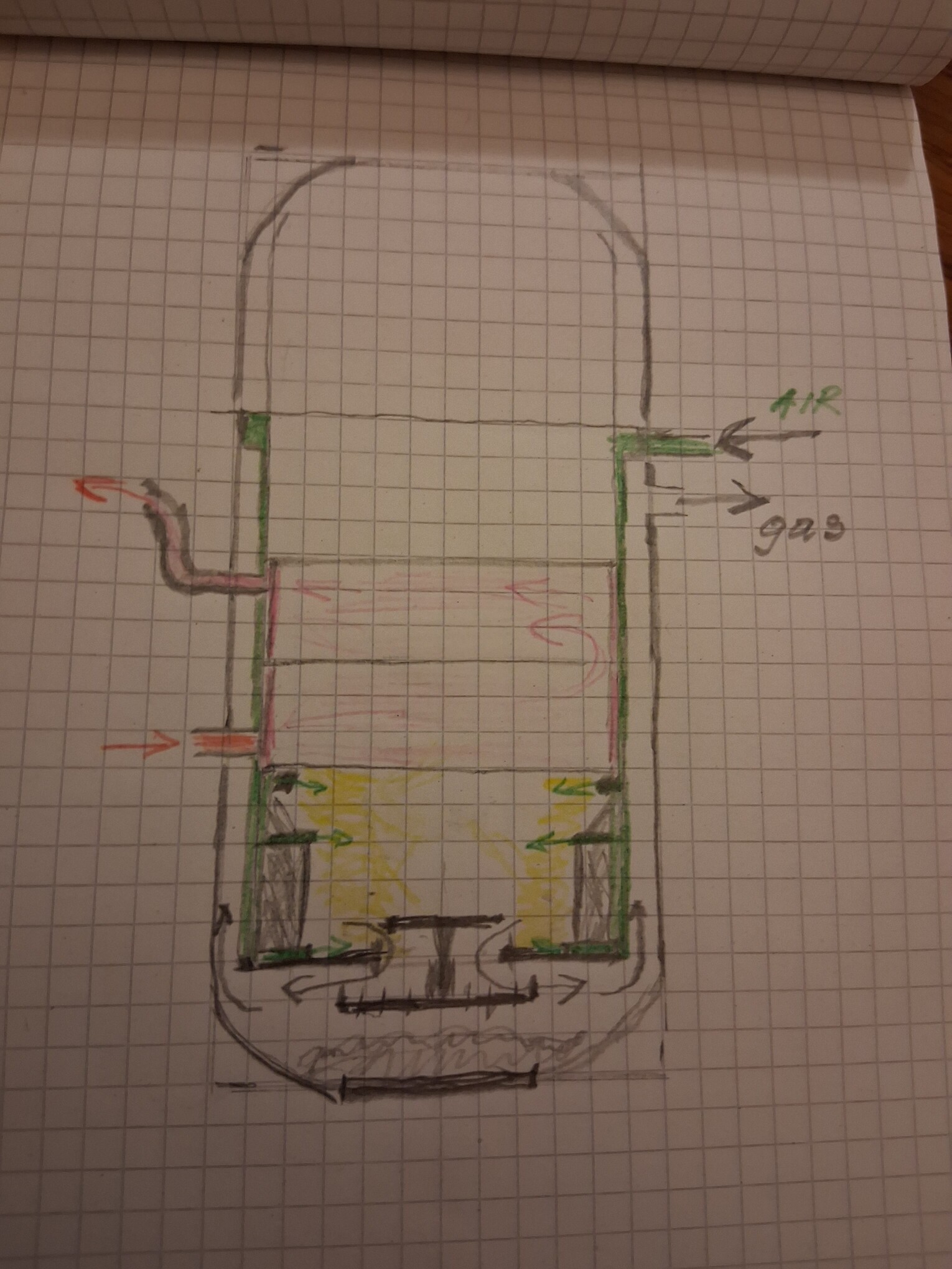 Joep, I haven’t decided yet how I’m going to make this most important part of the gasifier… I’ll definitely keep these dimensions of the wide and shallow hot zone. There are three levels of air nozzles here, so the gasifier’s capacity will be variable, fuel jamming and bridging will not be possible. The lower level of nozzles will perform a similar function to the middle nozzle, the only difference will be that the gas flow will be inward to the center, which is better from a temperature point of view, and the ash will also be deposited downwards. The production will be simpler, although not very simple. For the supply of fresh air, I will make another envelope made of thin sheet metal, which will surround the storage tank and the hot zone, so the air preheating will be very effective, and there will be a barrier for the condensation zone and a thermal shield between the hot exhaust gases and the resulting wood gas, which will cool on the outer wall,…