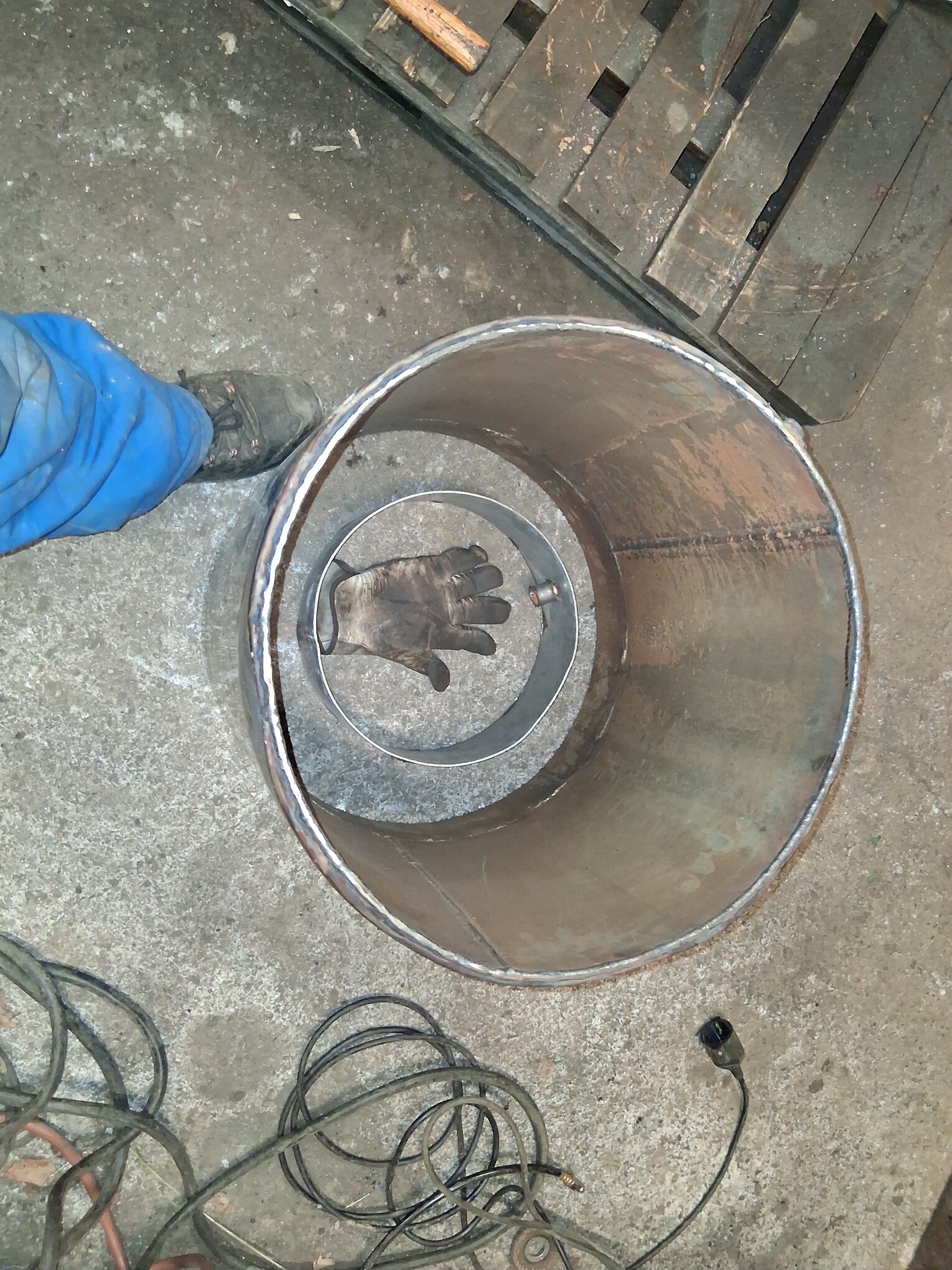The partition in the jacket for heating the funnel is welded, the plan is to continue the hot zone with the same diameter of 50 cm, which is a very large cross-section, well, I have another piece of the same diameter with a double wall available. I will use a piece with a height of 25 cm and make holes at the bottom for the exit of gas and ash, the picture shows how I plan to do this.