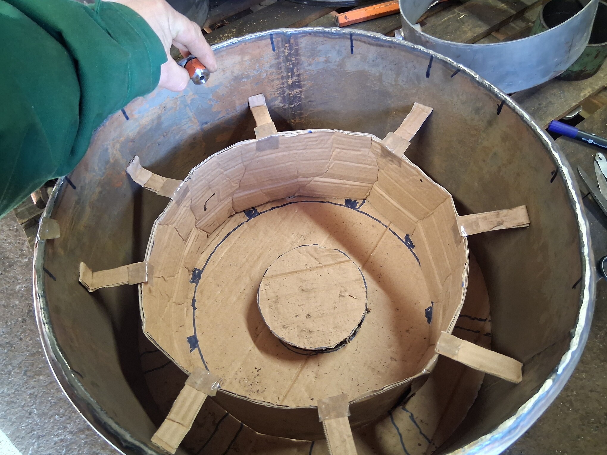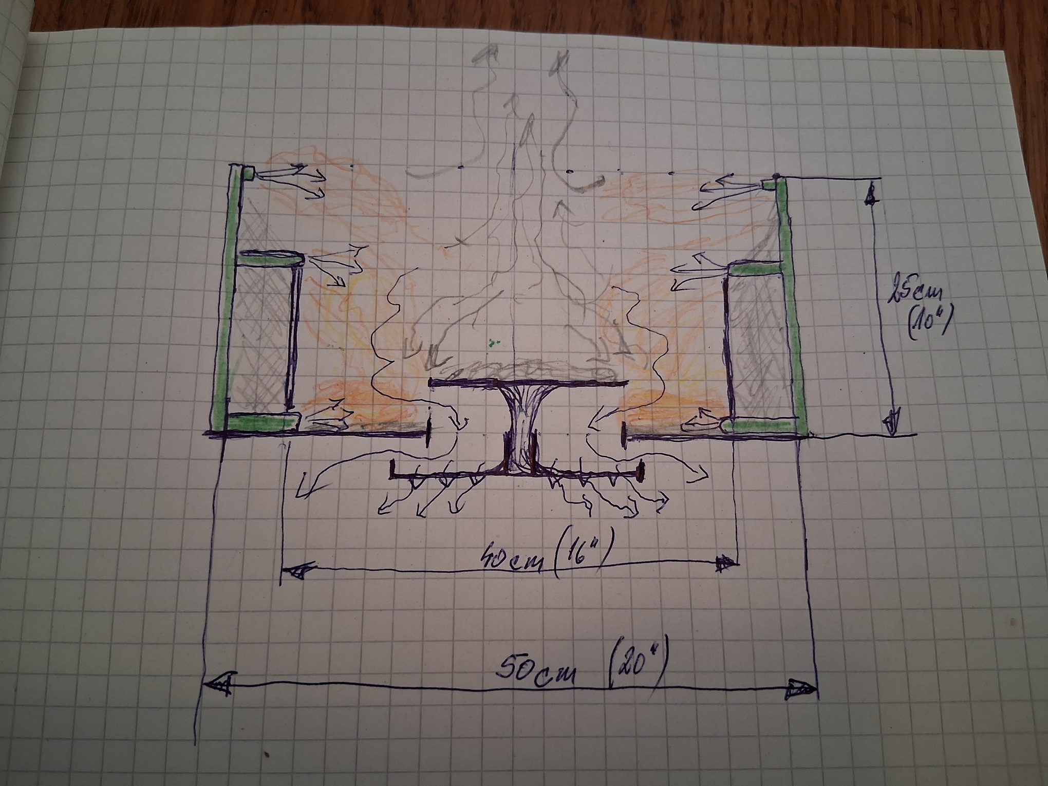 the lower nozzles will supply air close to the floor plate, we must be aware that the area here is filled with ash and fine charcoal, 10 cm of the path from the nozzle to the outlet is enough to consume all the oxygen, I notice this with the “Fergie” gasifier with a middle nozzle. The temperature load on the floor plate will be quite high, well, I expect that a layer of ash will quickly accumulate, which will protect the metal from high temperatures, I will also choose a more temperature-resistant metal. Below I plan to reinforce the floor plate with “fins”, which will also be a heat exchanger for redistributing the temperature and also for additional heating of the fresh air.