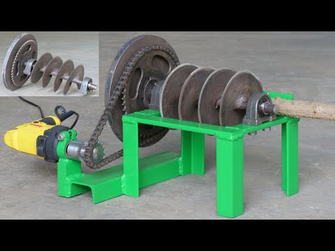 Here is a small screw chunker driven with a drill. It looks like a motorcycle gear and chain, then like 8" discs, but they only look like maybe an 1/8" thick, and a flywheel.