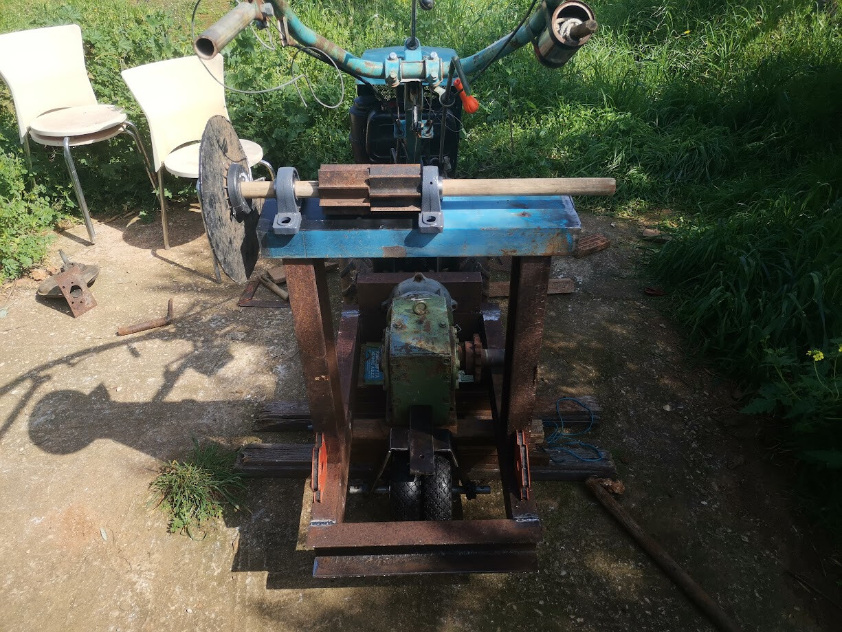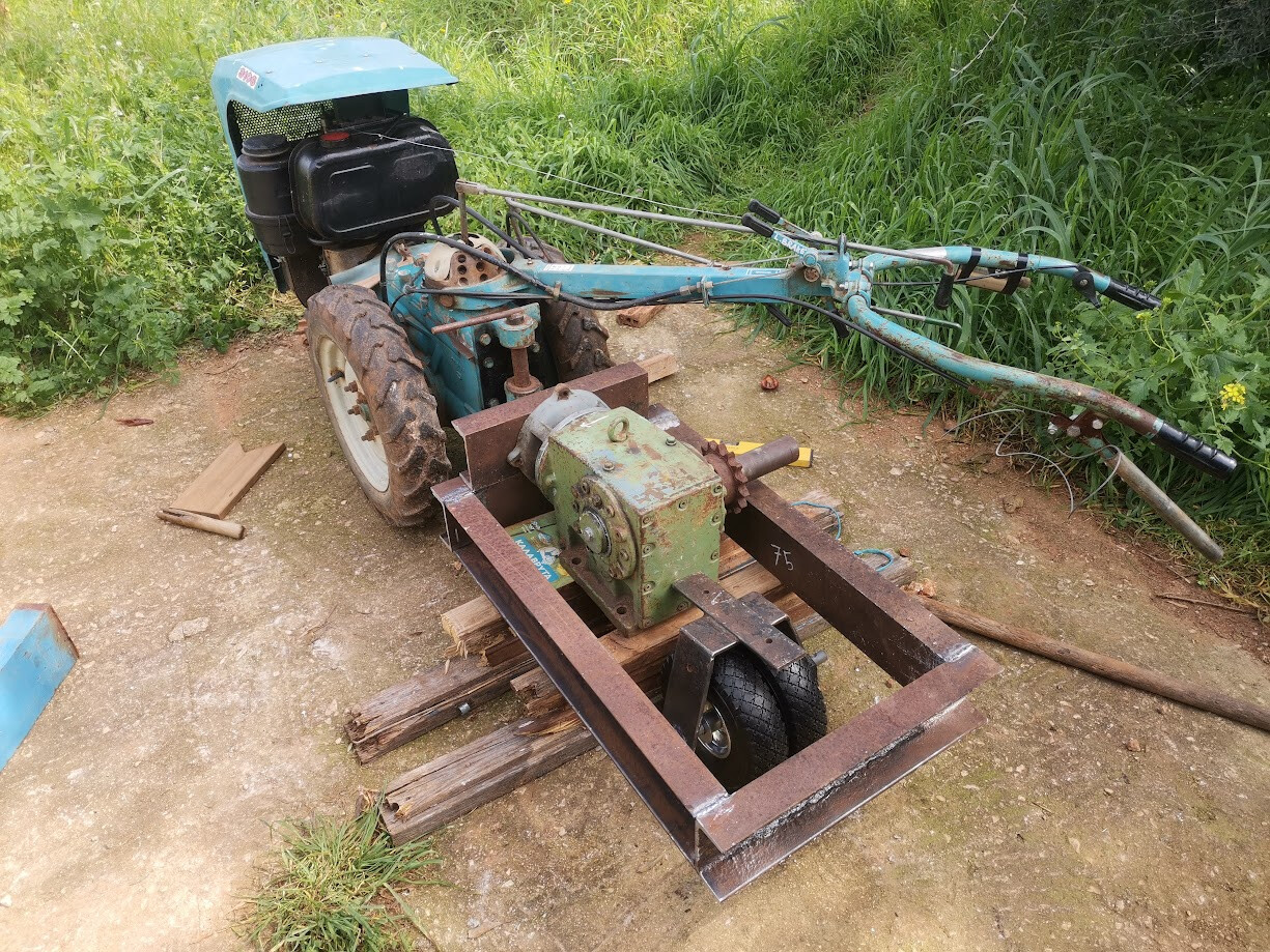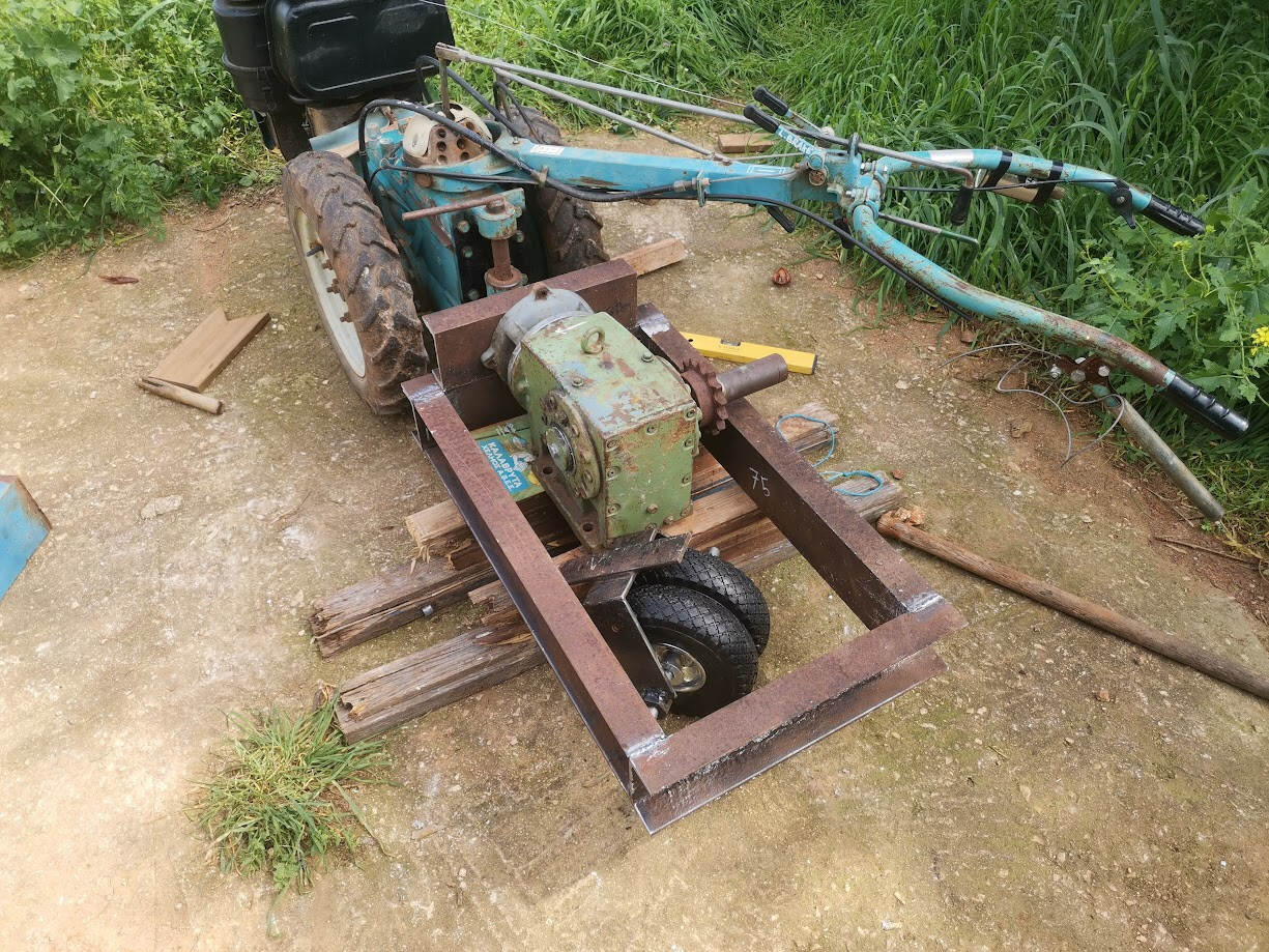 First a video showing the prototyping. I just threw this frame together in about an hour from absolute garbage wood. But it served its purpose in giving me a 1:1 model that I could stand around and think. Do ‘practice cuts’ and try out the ergonomics. The top PTO is 25mm / 1 inch at 843 RPM. The bottom one is 35mm / 1.37 inch at either 520 or 700 RPM. Their directions are different. The reducer in the video is 12:1. With an RPM of 843 for the top PTO, I will end up with 70 RPM on the working axle.