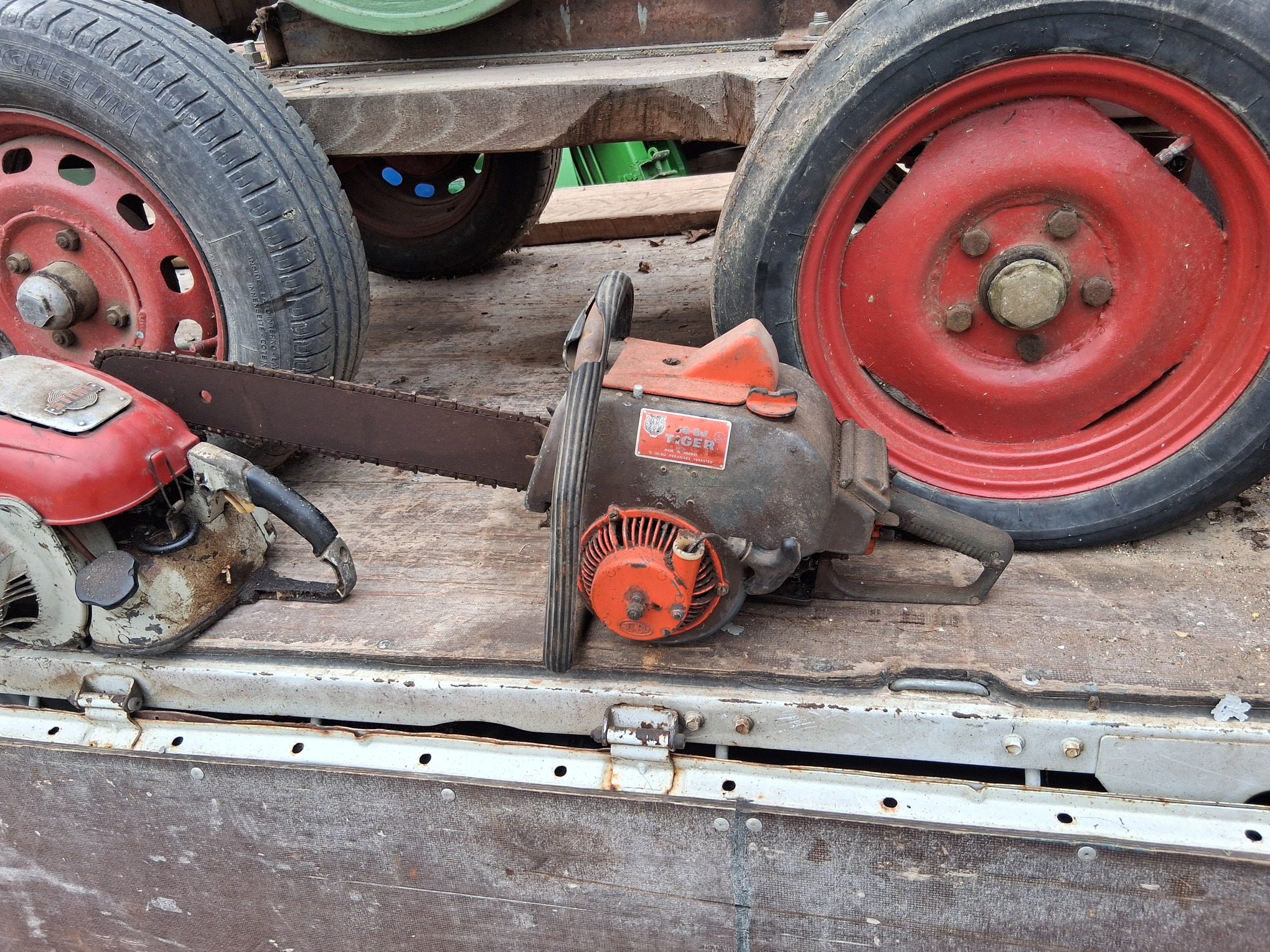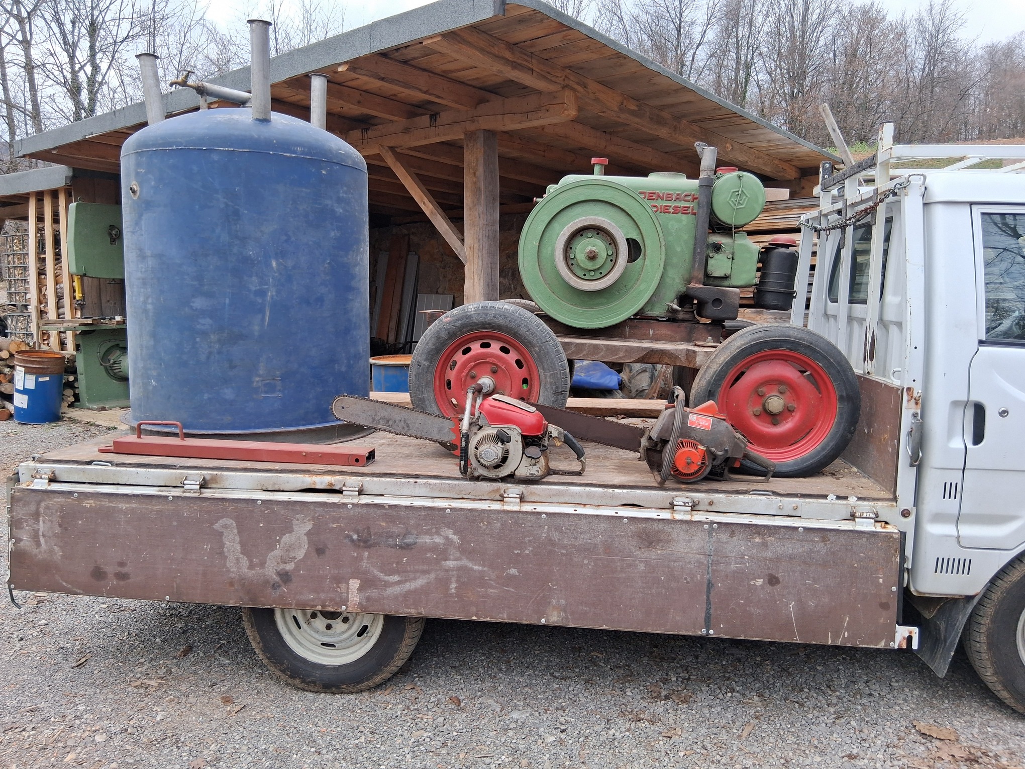 Nearby I found a perfectly preserved Jenbach engine, of course I immediately decided to buy it, well, for the price of scrap iron there was also a strong stainless steel container, … hmm, for 20 Euros I also loaded up a JO-BU TIGER chainsaw, and the Stihl Contra was “free”…