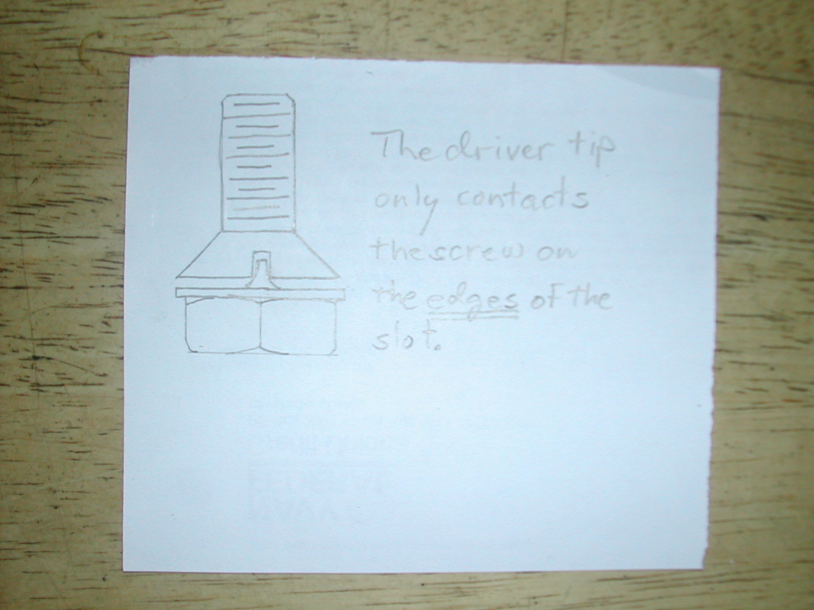 Diagram showing how the tip fits in the slot. The driver tip only contacts the screw on the edges of the slot.