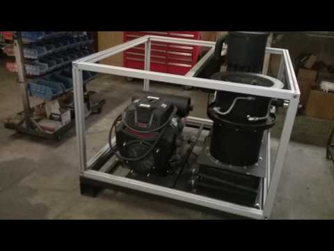 Doing a simple experiment, with boosting this one. Now that I have a system with the electronic mixer control this is doable. This is a really good time for this one as the machine isn’t outputting what it should be. So what Im using is the smog pump from the John Deeres set up. The gasifier on it is not lit Im just blowing through it and into the flex. The pump is on full bore with no bypass. I am seeing a definite improvement in both the output and stability. This pumps output is static though so this creates some small issues when throttle position changes. When I go to an actual turbo for this it will run linear with the engine eliminating this. Im pretty sure turbos will be apart of the packages soon, there is definitely power to be gained amongst other things. Because this is now under pressure this does aid the fuel drying process and also if there is any leaks they are basically eliminated as the pressure can only come in the jets on this This also solves some development work for upcoming technology and will be the driver to make it work.