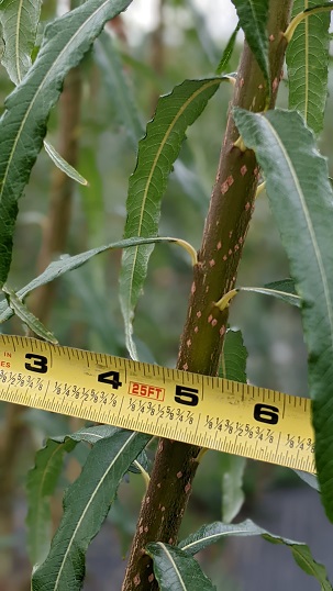 Saw logs they’re not, but we’re pleased with the half-inch/12 cm diameter growth in half a year. Of the 5 varieties we planted, 4 survived. These are the tallest and thickest. Some are bushier, partly because I let the deer fence sag a little too much. The thinnest cuttings basically all died. They had started to sprout before I planted them, which was not a good thing to do.