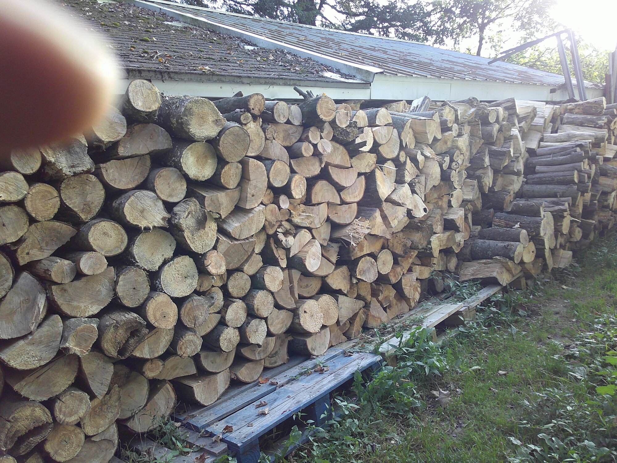 here in western Pennsylvania we have hardwood forests. We have on our homestead enough standing dead trees and down trees that I will never have to leave the property for firewood. This summer I was cutting in grove of maples, they over seed and grow up thicker than they will support themselves and naturally self select. Most of what I cut were the trees that died out or thinned out naturally, about 12" to 16" at the base. I mount a winch in the trailer hitch receiver of my pickup so that I can drive up into the grove and pull the trees to the back of the truck to cut and split. Here is a photo of this years wood pile: