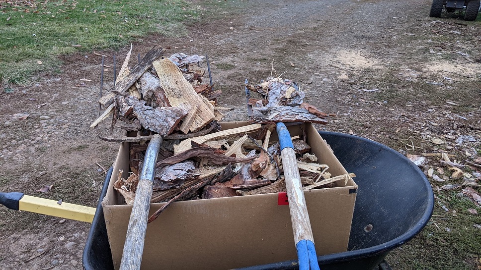 So this afternoon I split some nice, dry cottonwoood from a windfall near the neighbor-across-the-river’s driveway. My son had bucked it up. I brought it home and split most of it (some was tough enough that it will wait for the hydraulic splitter). When I finished, there were some small pieces laying around, and a bunch of bark left from the year’s firewood work. To save time, I got out the spading fork to pick it up. Then, somewhere in my cobwebby brain, this surfaced: