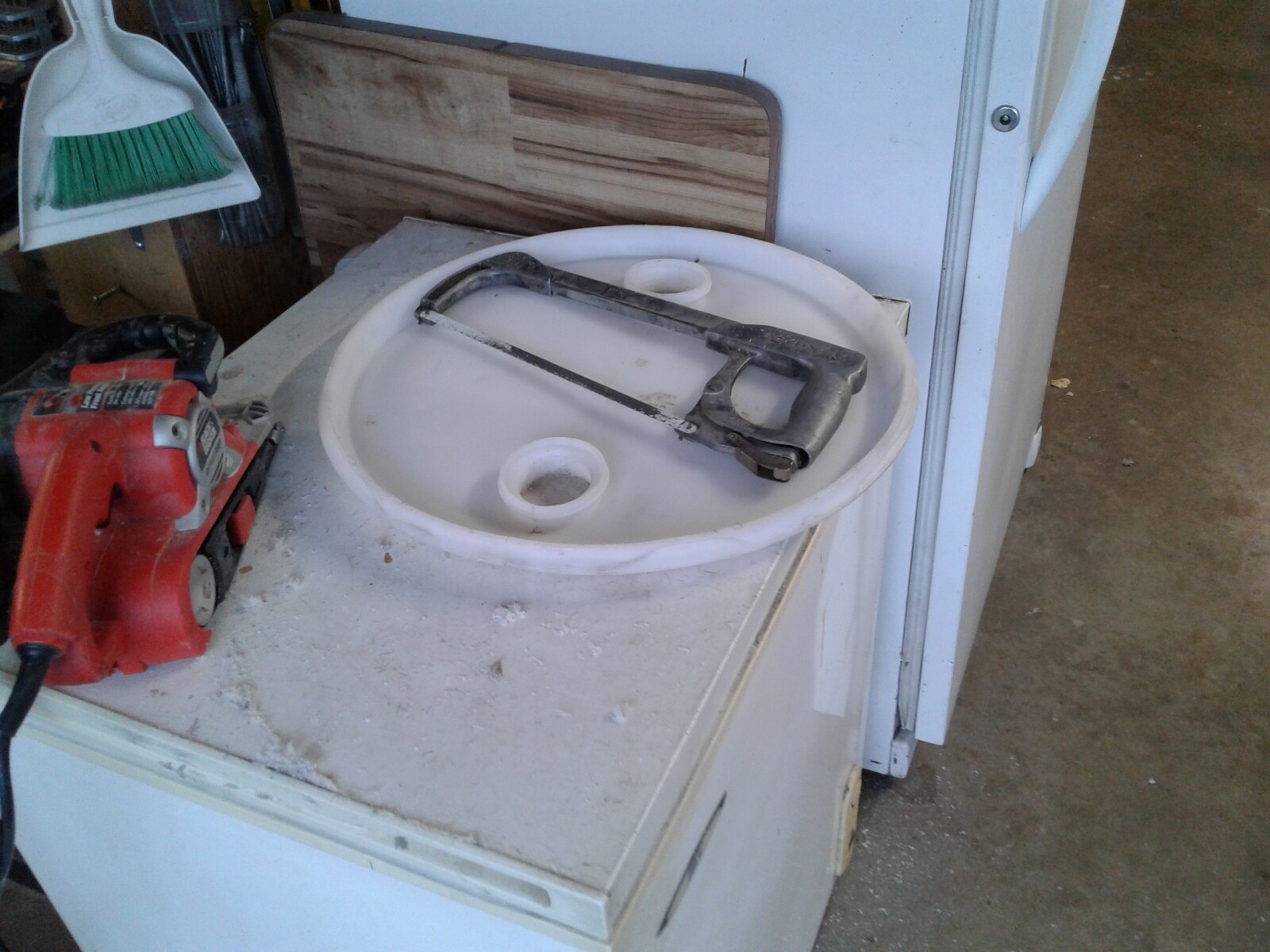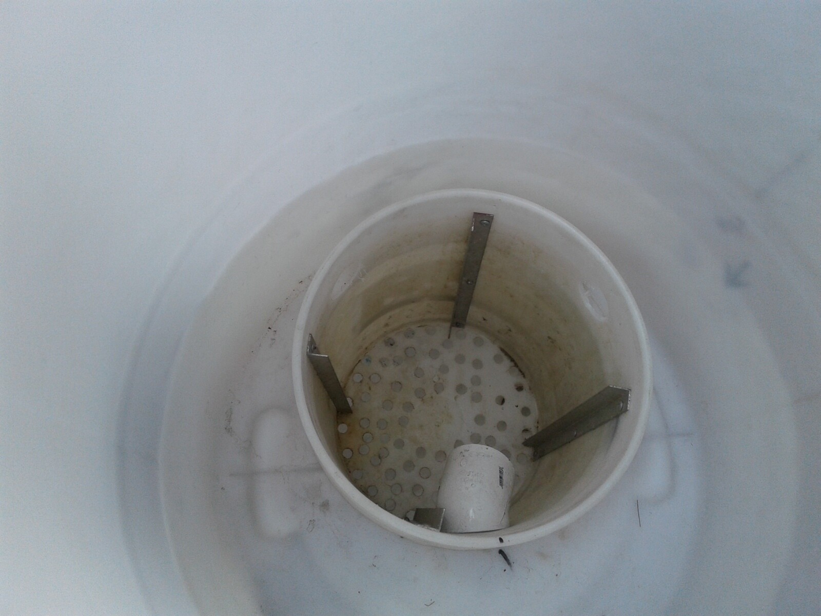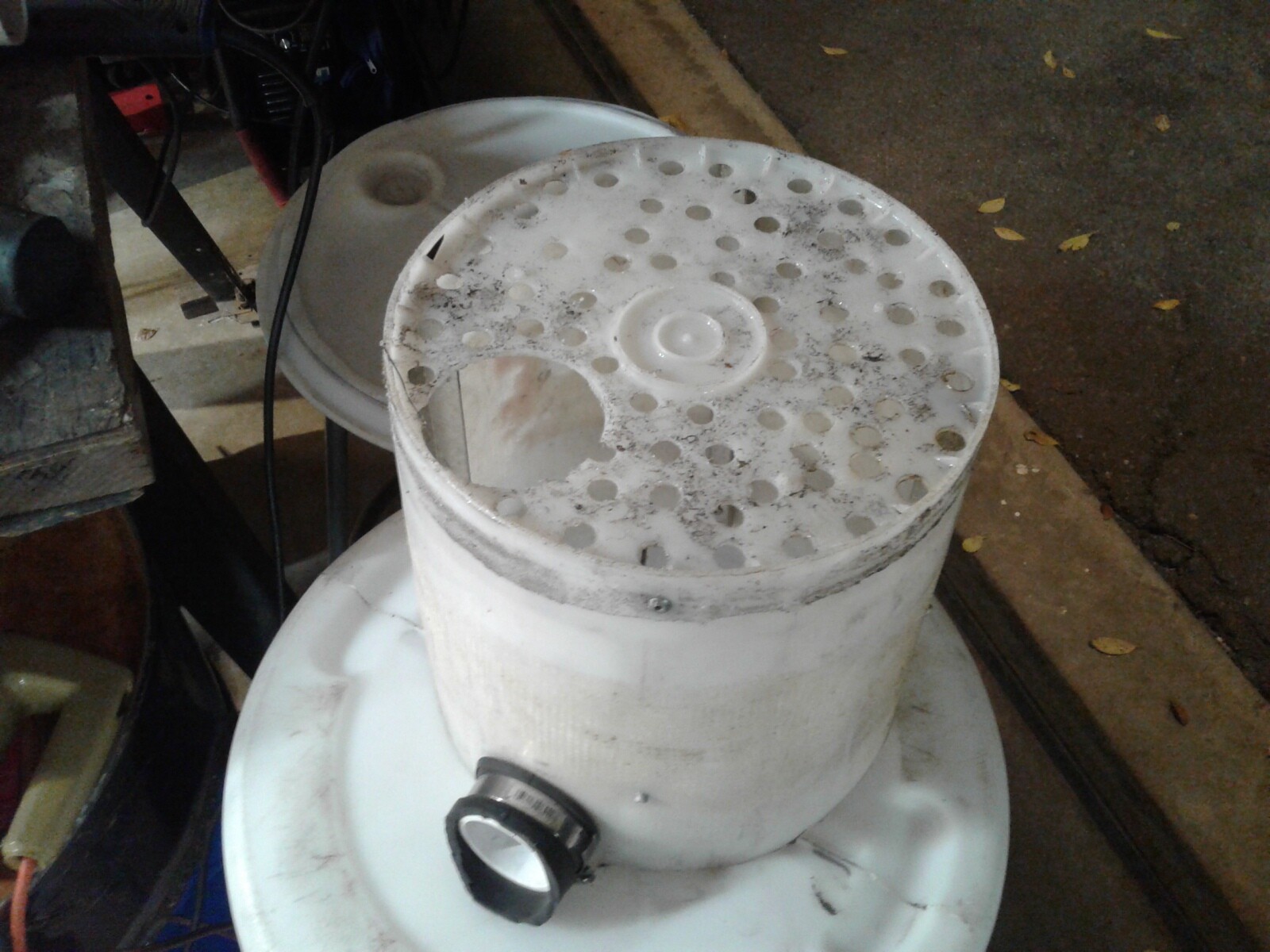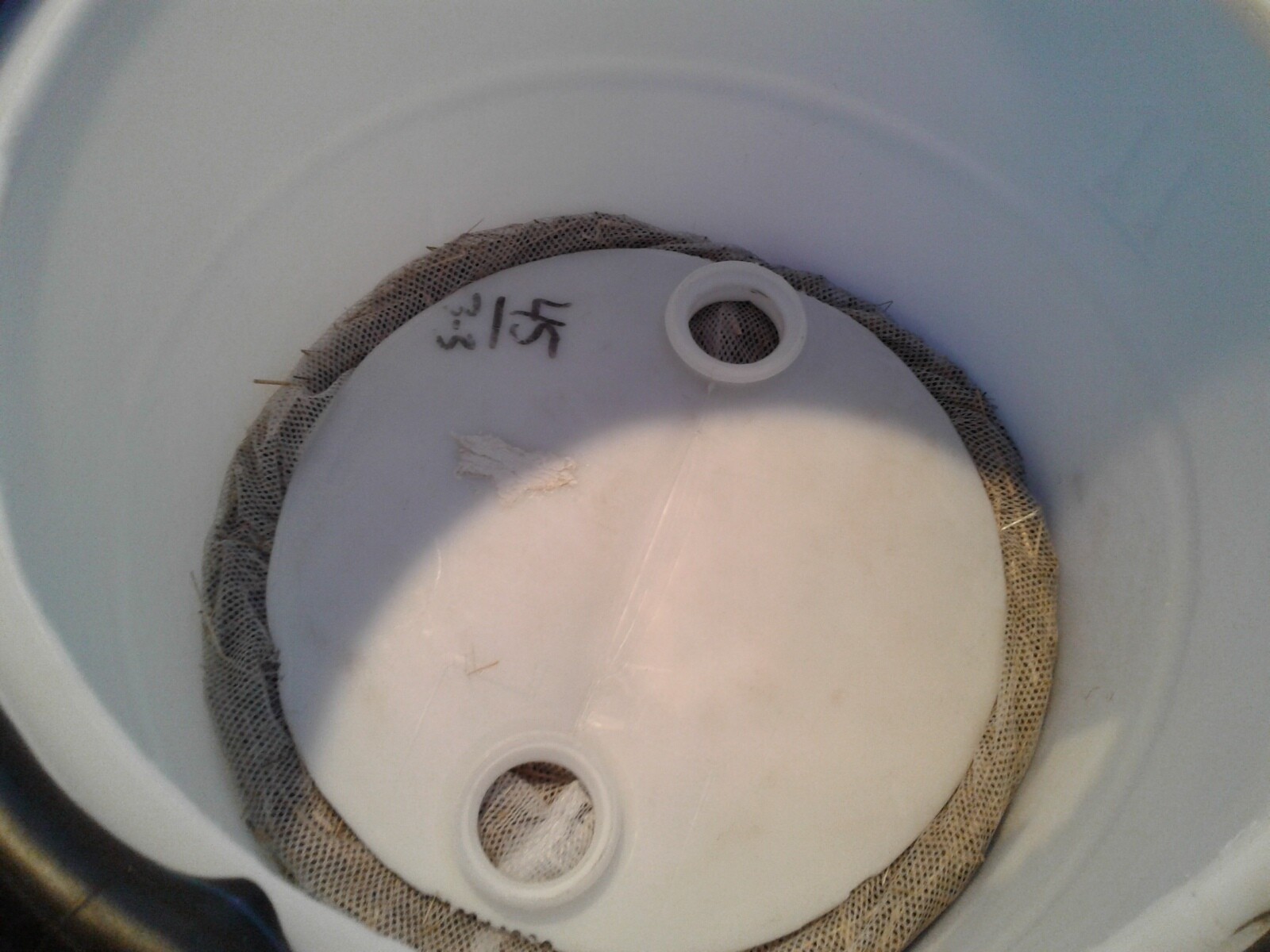 Look down into he bucket rim I realized the only way for water to exit the hay filter barrel was for water to seep around the bucket edge, so I hole saw two holes so water can not build up there when washing my hay down to clean it.