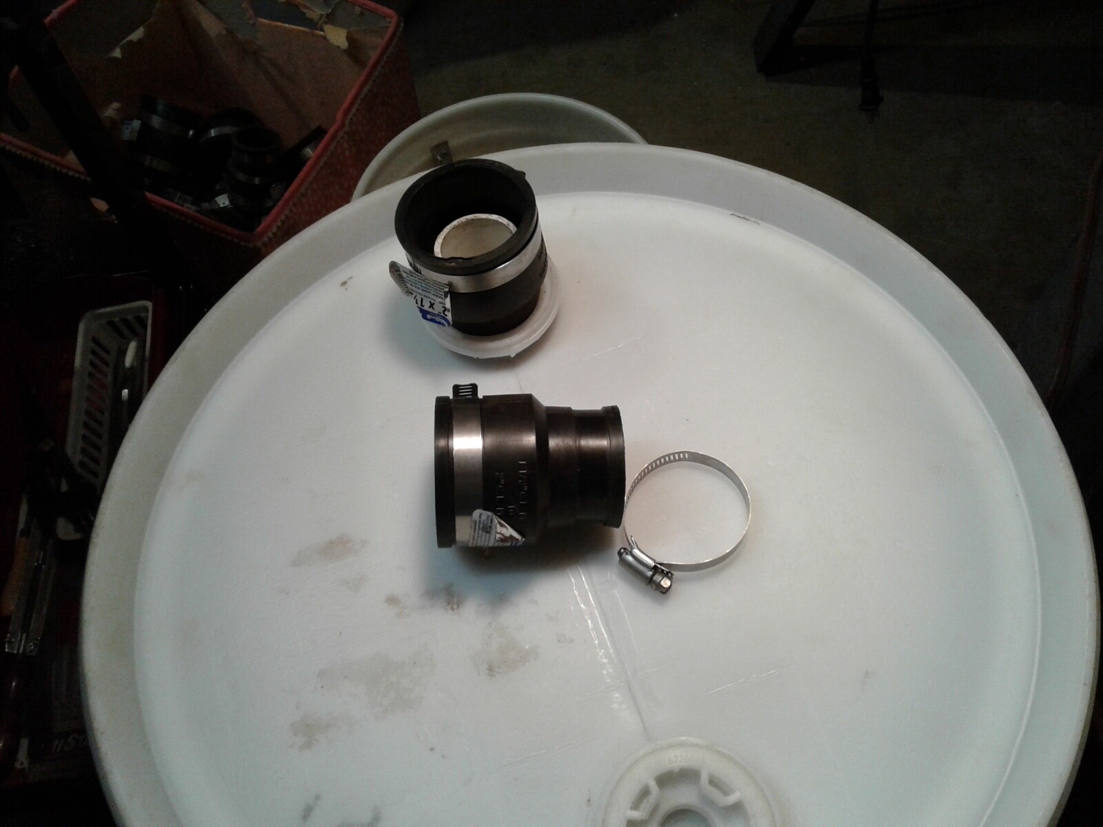 For the filter lid gas exit I used the same type of rubber coupling 2" to 1 1/2" did a little grinding on the 1 1/2" edge a put the 1 1/2" pipe into it. Then screwed into the fine thread of the barrel hole.