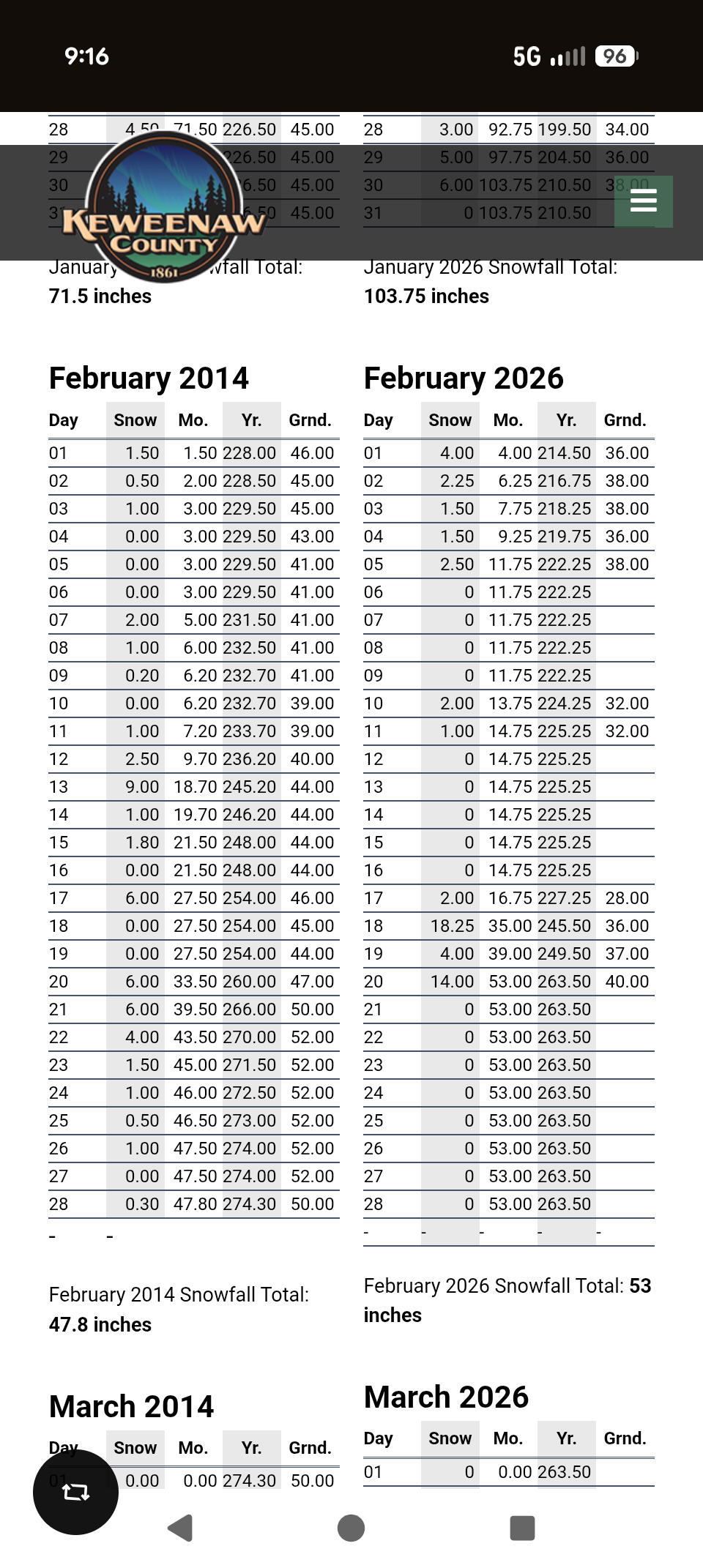 These recent storms brought more snow at once, but we had more snow on the ground then. It was 8ft deep on our snow shoe trail then.