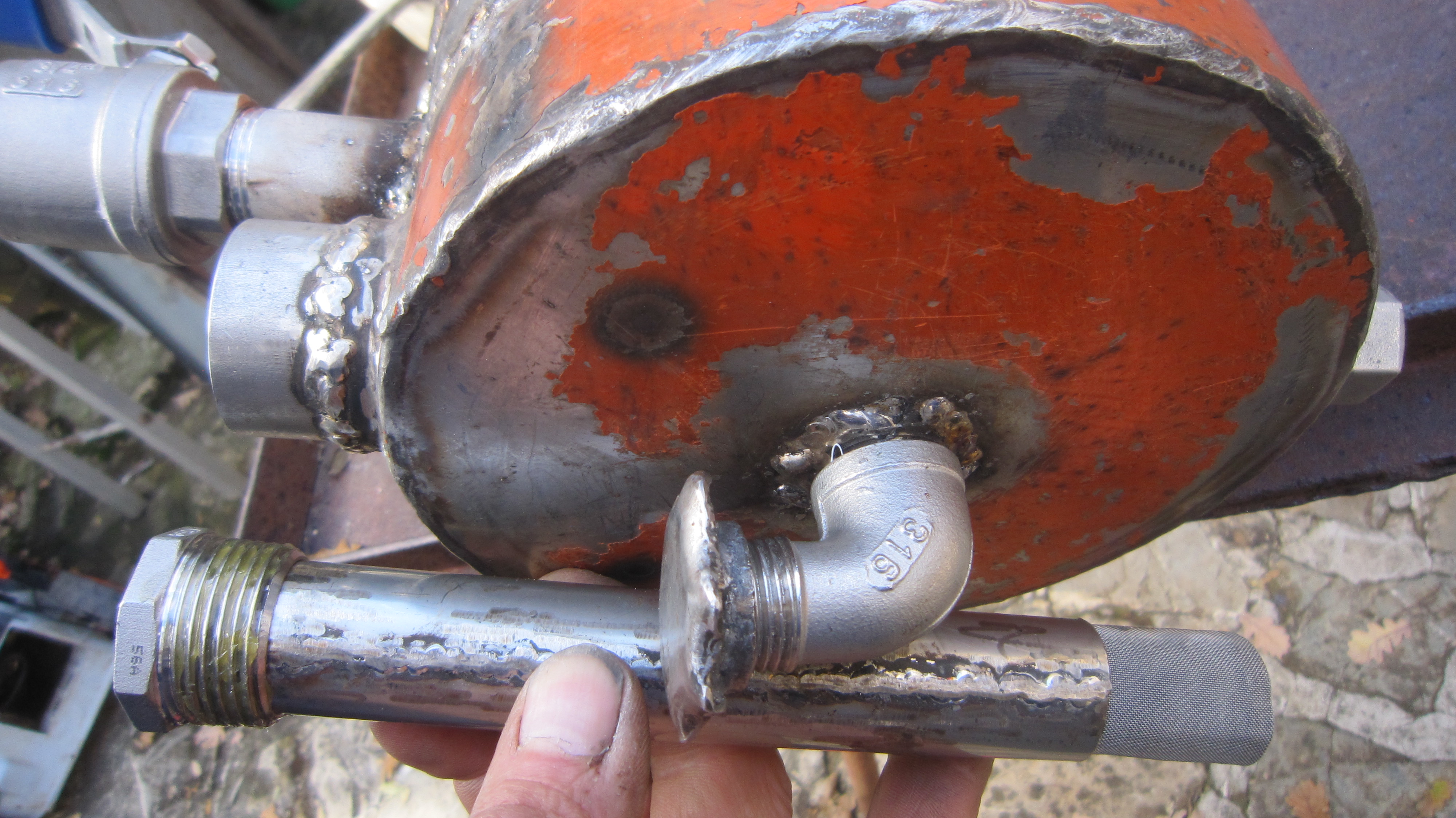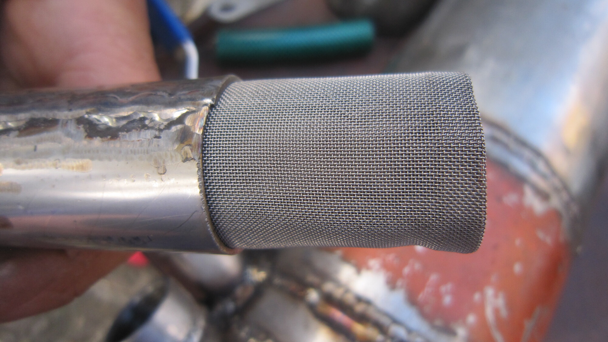 a bubbler with holes makes continuous nice round bubbles…this can be less effective, because in the bubble the dust travels indisturbed…therefore we choosed the reverser for more chaotic insted of regular bubbles…today we added some fine mesh in the gas path for make it more chaotic …breaks the bubbles more often, dust should become more wet…resistance tested with blowing in the tubing system with the mouth, seems not much resistance