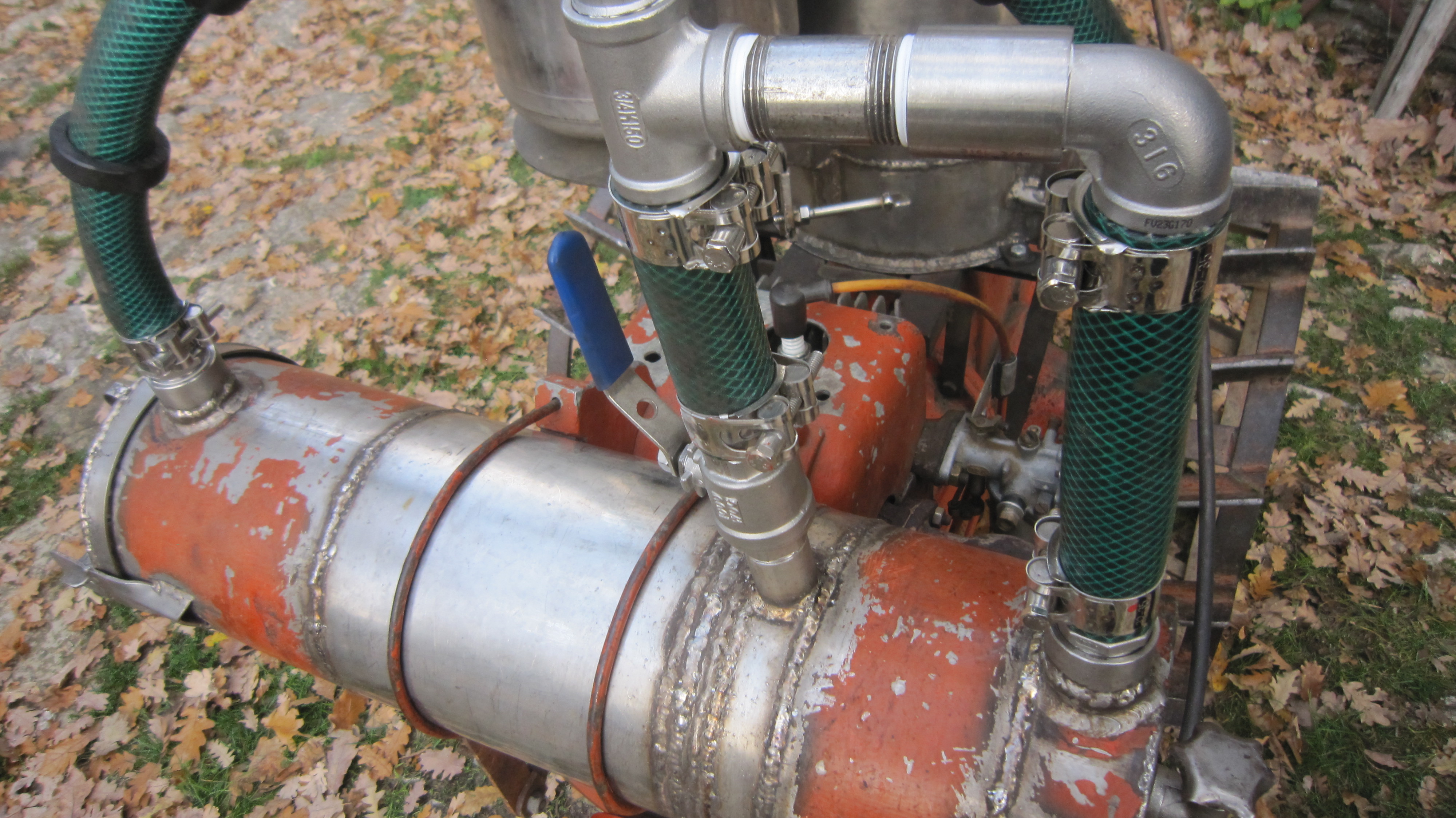 with the horizontal filter it comes out at least that is best to keep open during run also the starter bypass, so there are less turbulences in the water chamber, a little part of the gas stream goes through the water and keeps the filter medium umid, what gives a better filtering as when it is too dry or dried out during operation by the warm gas…this amount of gas that goes through the water can be regulated with the valve, more close the bypass valve, more gas must go through the water bath…but, as said, vertical filter is easier and more safe in operation…here on the motorcultivator though was no space for it so we used the basement of the former gasoline tank