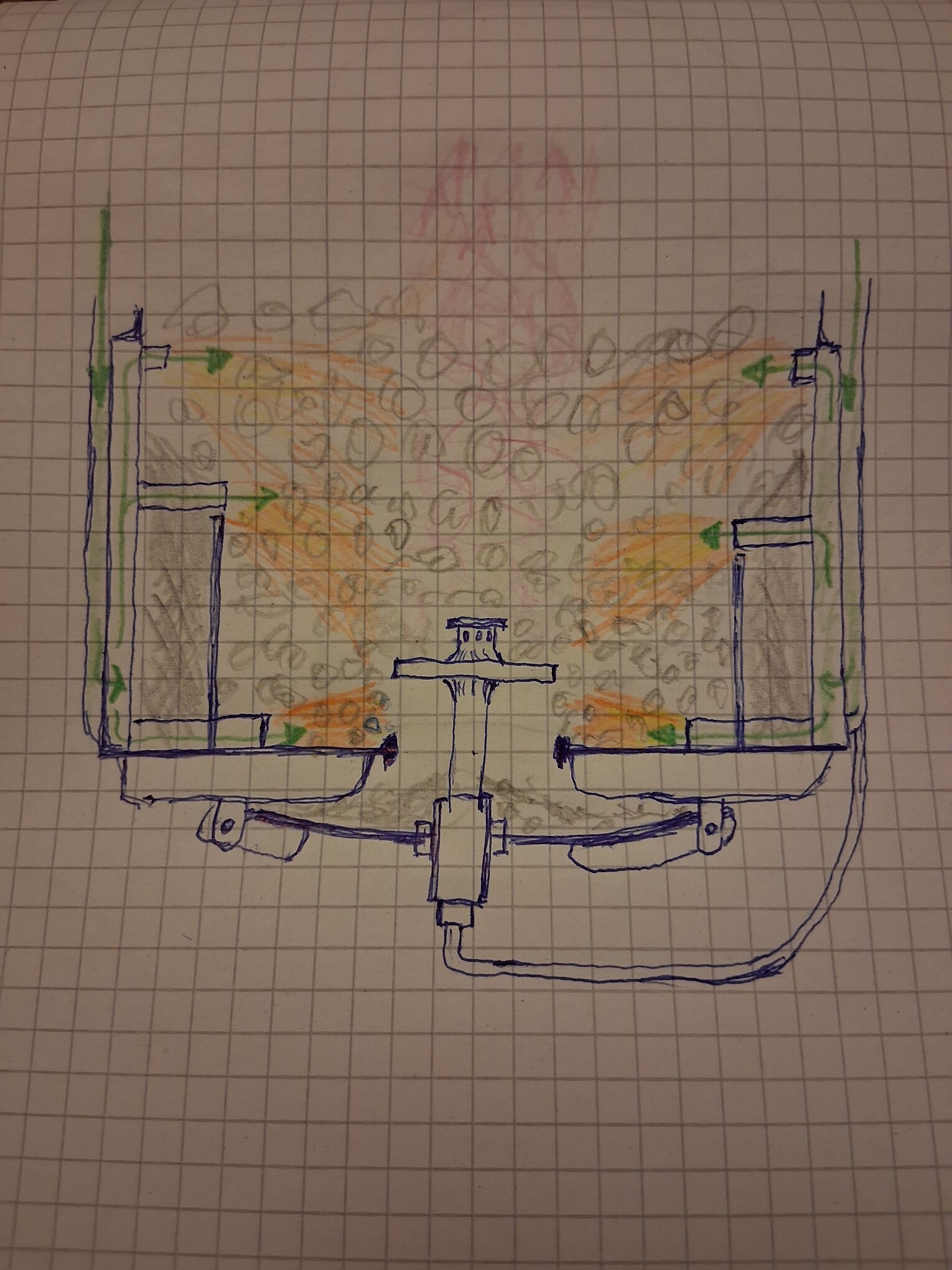 I drew a sketch, to give a better idea of what is happening in the hot zone and the function of the middle nozzle. If I make holes under the diaphragm, it makes no sense, because there is an empty space here, air can be supplied above the diaphragm, where there is an area with fine charcoal. Does this make sense? If I take into account the fact that the middle is usually the hottest area, where the gases rise upwards, there is no need for additional temperature here, well, there is no need to perform the “cleaning” function here either, this task is now performed by the lower nozzles,… I see no real reason to perform the connection shown in the sketch,… but now to prepare the tube and make a seat of 8 mm in a hexagonal drill, there is no cost or difficulty,…