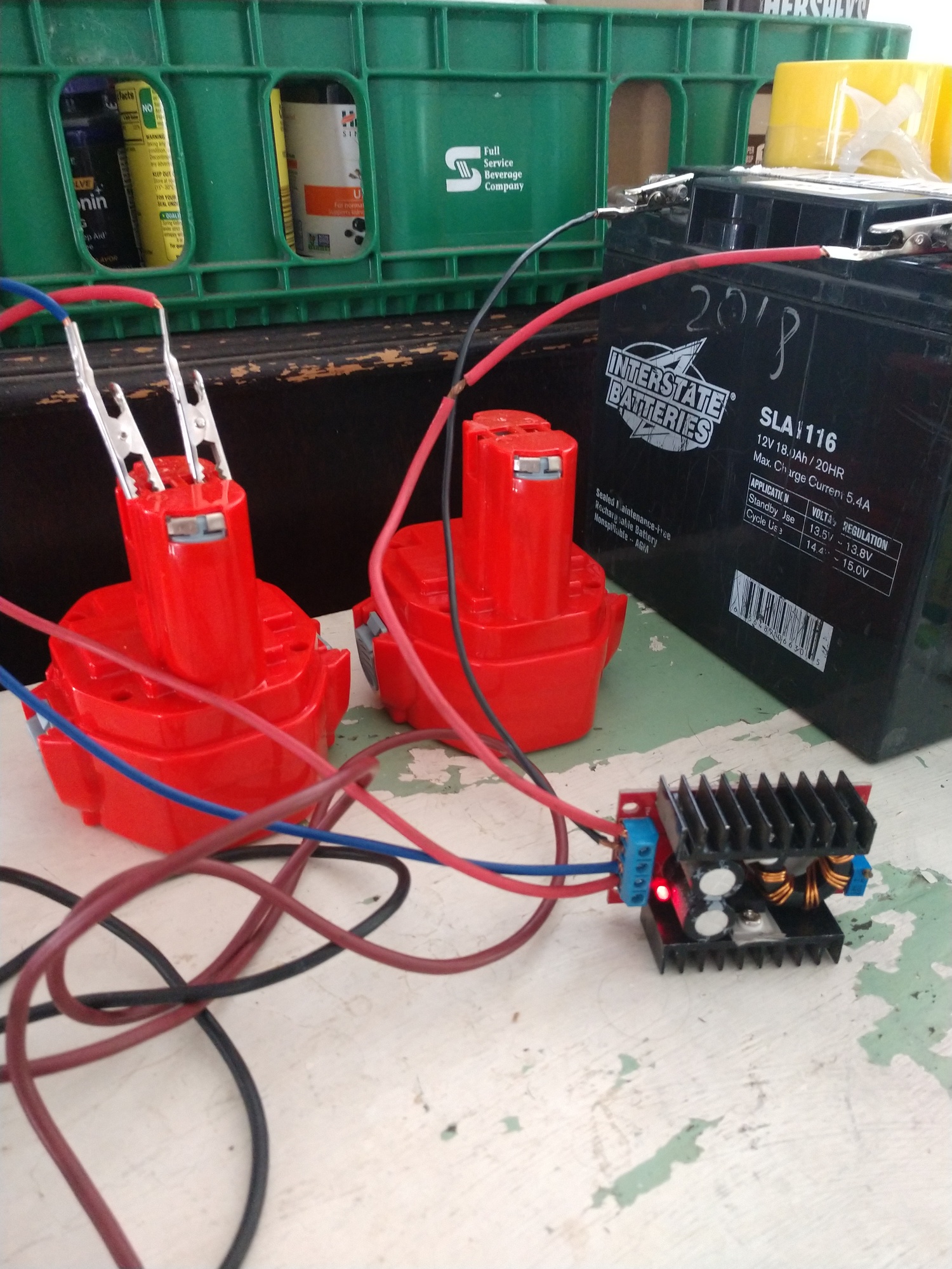 I don’t have a nickel metal hydride charger for these replacement batteries. So I am using a 150 watt boost converter. Using a 12vdc SLA battery to power the converter. Then I charge the batteries in 1/2 volt increments. I keep feeling the converter and the battery for overheating. It’s slow, but I don’t need the tools the batteries power yet either, so its working.