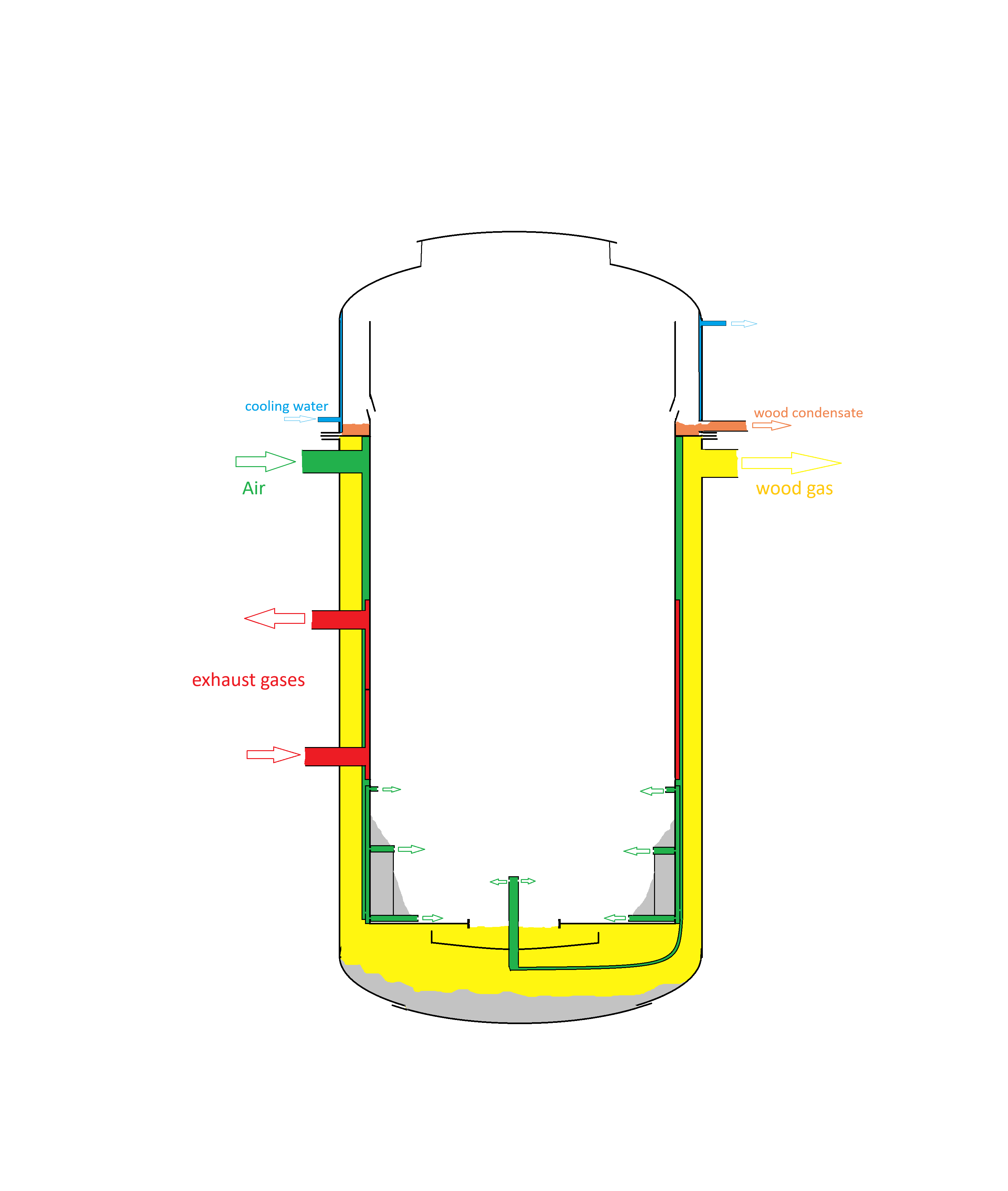 Thank you Tone for this excelent drawing, on how your gasifier is built. I will have to say no one has ever built a gasifier like this one ever before. So well thought out on the design and all. The hot exhaust engine gases do two things, it heats your incoming air to the nozzles and helps with the pyrotizing of the hopper stored wood above the firetube. Your welding skills are very good. Looking forward to more videos.